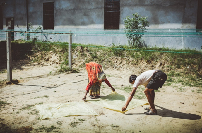 After Harda dyeing, the fabric needs to lay flat and dry in the sunlight . The fabric will have a yellowish tint after this stage, which will later disappear once washed.