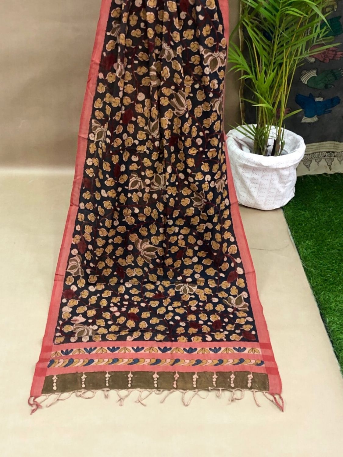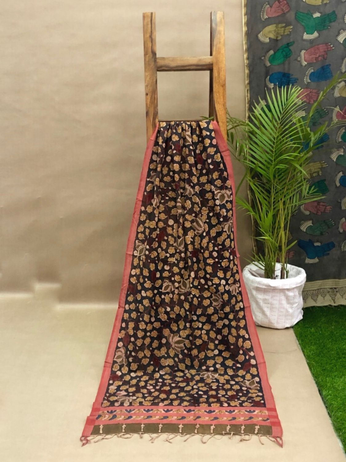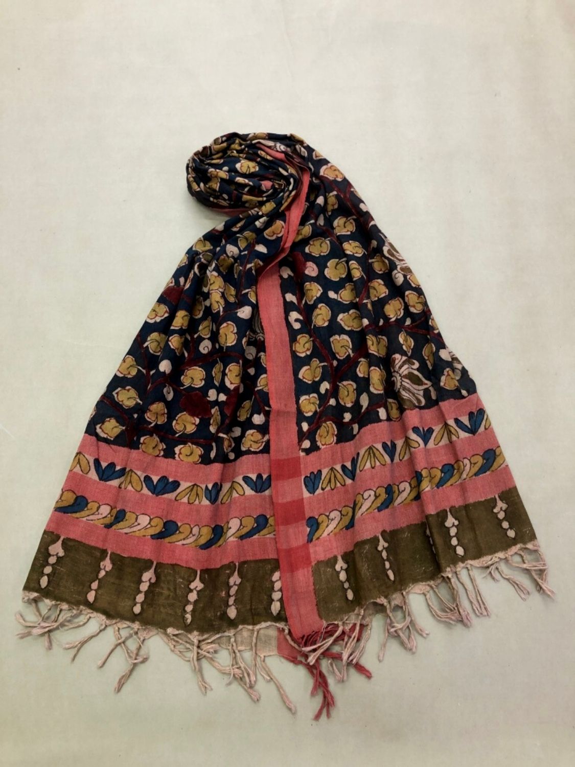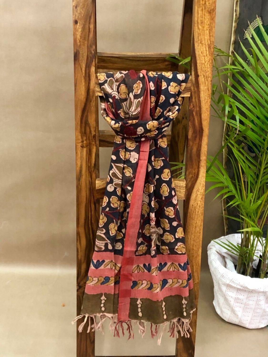 These proposed stoles are of handwoven cotton and authentic natural colors Pen-Kalamkari. These can be paired with traditional as well as contemporary styles like tops, skirts, shirts, suits, and western dresses. It can cover or protect from free radicals present in the environment and the direct UV sun rays.