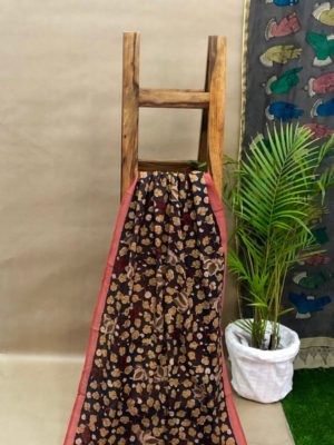 Pen-Kalamkari is totally freehand drawing and natural colors are most authentically used to fill up the backgrounds. Although fast fashion has replaced natural colors with pigment colors nowadays for brightness as well as to fasten the production.