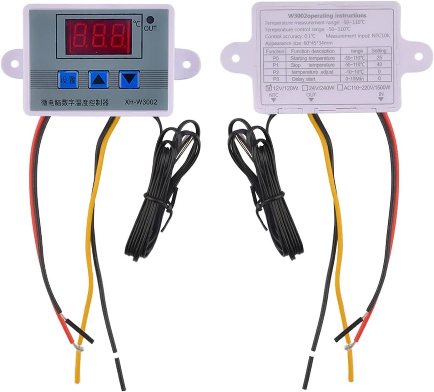 Temperature ControllersXH-W3002 Temperature Controller AC110V-220V DC12V/24V LED Digital Control Thermostat Microcomputer Switch Thermoregulator SensorFeature:The high-brightness digital tube clearly displays, whether it is used during the day or at night, it can be read clearlyThe sensor can be replaced at will by using the 2P terminal. When you need to use other probes, you can replace it at willABS material shell, exquisite and beautiful, high mechanical strength, good electrical performance, anti-aging-50~110 ultra-wide temperature control range, can be used in various temperature control fields, 0.1 temperature control accuracy, to meet your control needsWiring input and output design, more convenient to use in various industrial control equipment, multi-strand wire 300V/20A excess configuration, safe and reliableSpecifications:Product name: Microcomputer temperature controllerProduct Model:XH-W3002Temperature measurement range: -50~110Temperature control range: -50~110Temperature measurement accuracy: ±0.2Temperature control accuracy: ±0.1Measurement input: NTC10K L=1 meter waterproof probeInput power: 12/24/220VOutput power: 120/240/1500Woutput type: direct outputOutput capacity: max 10AInstallation hole distance: 73mm (diameter 4mm)Appearance size: 60*45*31mmSet Up Using:Code and function introductionP0 set startup temperaturePress the setting button once to enter the internal menu, the default display is P0, press the setting button again, and set the required startup temperature by pressing the up and down buttons.P1 set stop temperaturePress the setting button once to enter the internal menu, the digital display is P0, switch to P1 by pressing the up and down buttons, press the setting button again, and set the desired stop temperature by pressing the up and down buttons.P2 Set temperature correctionEnter the internal menu in the same way, switch to P2 by pressing the up and down buttons, press the setting button again, and set the required calibration temperature by pressing the up and down buttons. In the setting, if the detected temperature value is 0.5°C higher than the actual temperature value, the calibration temperature to be set is -0.5°C. If the detected temperature value is 1°C lower than the actual temperature value, the calibration temperature to be set is 1°C. Detected temperature±corrected temperature=actual temperature.P3 set delay startEnter the internal menu in the same way, switch to P3 by pressing the up and down keys, press the setting key again, and set the required delay time (unit is minutes) by pressing the up and down keys. Delay start is generally used for compressor refrigeration. If it is used for refrigerator freezers, this value needs to be set. According to the size of the compressor back pressure, the general setting value is 3-6 minutes. If you are not used to control the compressor or do not need delay time function, skip this item directly.Package Included:Thermostat X1==========Is Smart Device : NoUse : IndustrialDisplay Size : 1.9 Inches & UnderProduct name : Microcomputer temperature controllerProduct model : XH-W3002Temperature measurement range : -50 to 110Temperature control range : -50 to 110Temperature measurement accuracy : ±0.2Temperature control accuracy : ±0.1Measurement input : NTC10K L=1 meter waterproof probeInput power : DC12V/24 AC110V-220VOutput power : 120/240/1500WOutput type : direct outputOutput capacity : max 10AInstallation hole distance : 73mm (diameter 4mm)Appearance size : 60*45*31mm