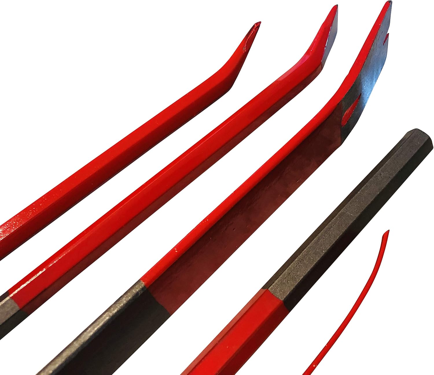 Made of HD Alloy Steel, Square Steel Shanks, and Polished Tips. Includes: 18" Wrecking Bar, 18" Jimmy Bar, 15" Flat Pry Bar, 11-1/2" Cold Chisel and 7" Stubby Flat Pry Bar.