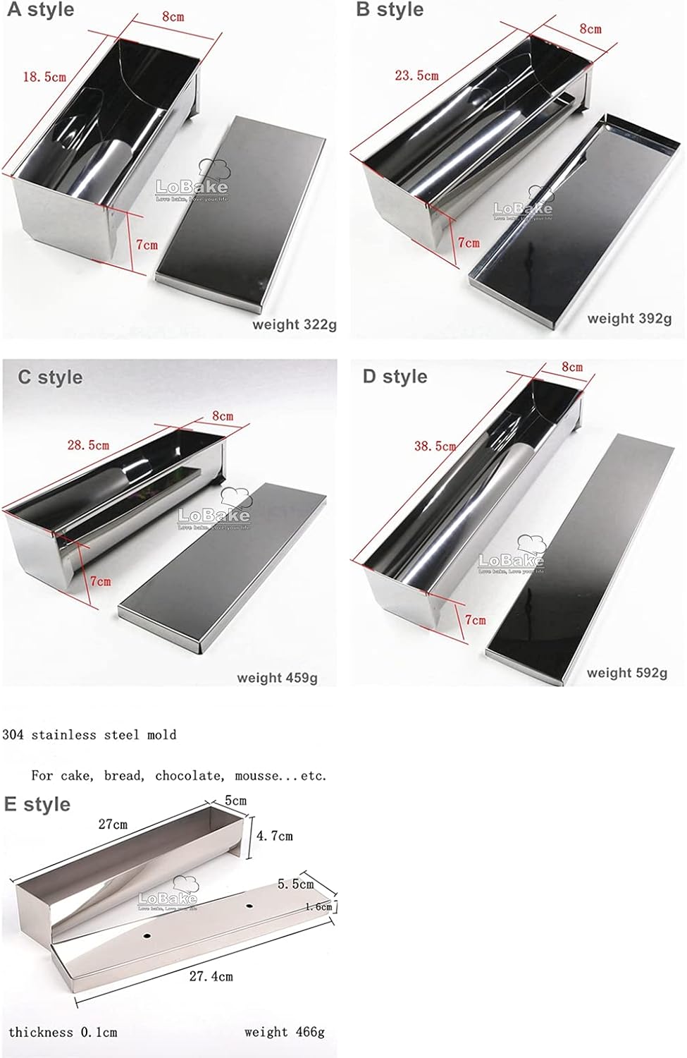 A style size: 8*7*18.5cm weight:322g/piece B style size: 8*7*23.5cm weight:392g/piece C style size: 8*7*28.5cm weight:459g/piece D style size: 8*7*38.5cm weight:592g/piece E style Mold 27*5*4.7cm Lid 27.4*5.5*1.6cm weight:466g/piece