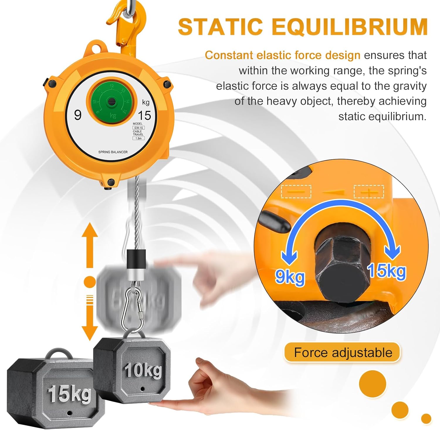 Retractable Spring Balancer 9-15kg(20-33lbs) - Heavy Duty Tool Hanging EquipmentProduct Features & Advantages1. Durable Heavy-Duty ConstructionMade of premium heavy-duty steel, this spring balancer boasts exceptional sturdiness and is not easy to deform. The surface is treated with professional powder coating, which provides strong anti-corrosion and rust-resistant performance, ensuring long-term reliable use even in workshop or industrial environments.2. Optimal Load Capacity & Stable PerformanceSpecifically designed for tools weighing 9-15kg (20-33lbs), it is equipped with aviation-grade steel wire rope that features high tensile strength. A built-in anti-collision buffer rubber sleeve effectively reduces impact force during use, protecting both the equipment and the tools.3. Adjustable & User-Friendly DesignComes with a 1.5m (5ft) long steel wire rope, and the internal spring tension is adjustable. Operators can easily adjust the spring tightness and rope height according to personal working needs, keeping tools in an ideal position for immediate use, which greatly improves operation efficiency.4. Precise Dimensions & WeightProduct size: 13.5*7.1*5.5 inches (34.3*18*14 cm); Net weight: 4.1kg (9.0 pounds). The compact and reasonable structure makes it easy to install and use without taking up too much space.5. Versatile Application ScenariosPerfect for various industrial fields, including factories, assembly lines, automobile maintenance workshops, machinery manufacturing, and parts welding. It is ideal for hanging electric tools, pneumatic tools, and other heavy equipment, reducing worker fatigue significantly.6. Reliable Safety ProtectionEquipped with high-strength forged hook and reliable self-locking buckle. The safety lock design can effectively prevent tools from accidental falling during operation, ensuring the safety of operators and avoiding tool damage.Package Included1 * Retractable Spring Balancer (9-15kg/20-33lbs)