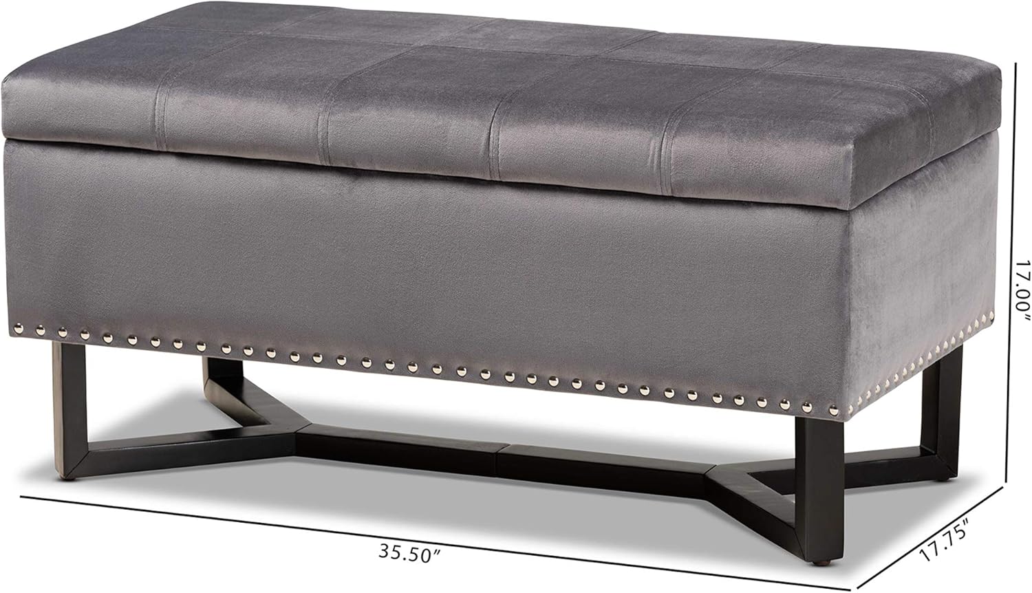 Add a tranquil accent to your space with the Esther ottoman. Made in China, the Esther is comprised of a sturdy wood frame padded with soft foam and upholstered in smooth velvet fabric. Its lift up top reveals a spacious storage compartment for extra blankets and linens. Requiring assembly, the ottoman is set on a dark brown finished wood base that lends an elegant aesthetic. Grid stitching and silver finished metal nailheads add modern style, making the Esther ottoman an eye catching addition to any space.