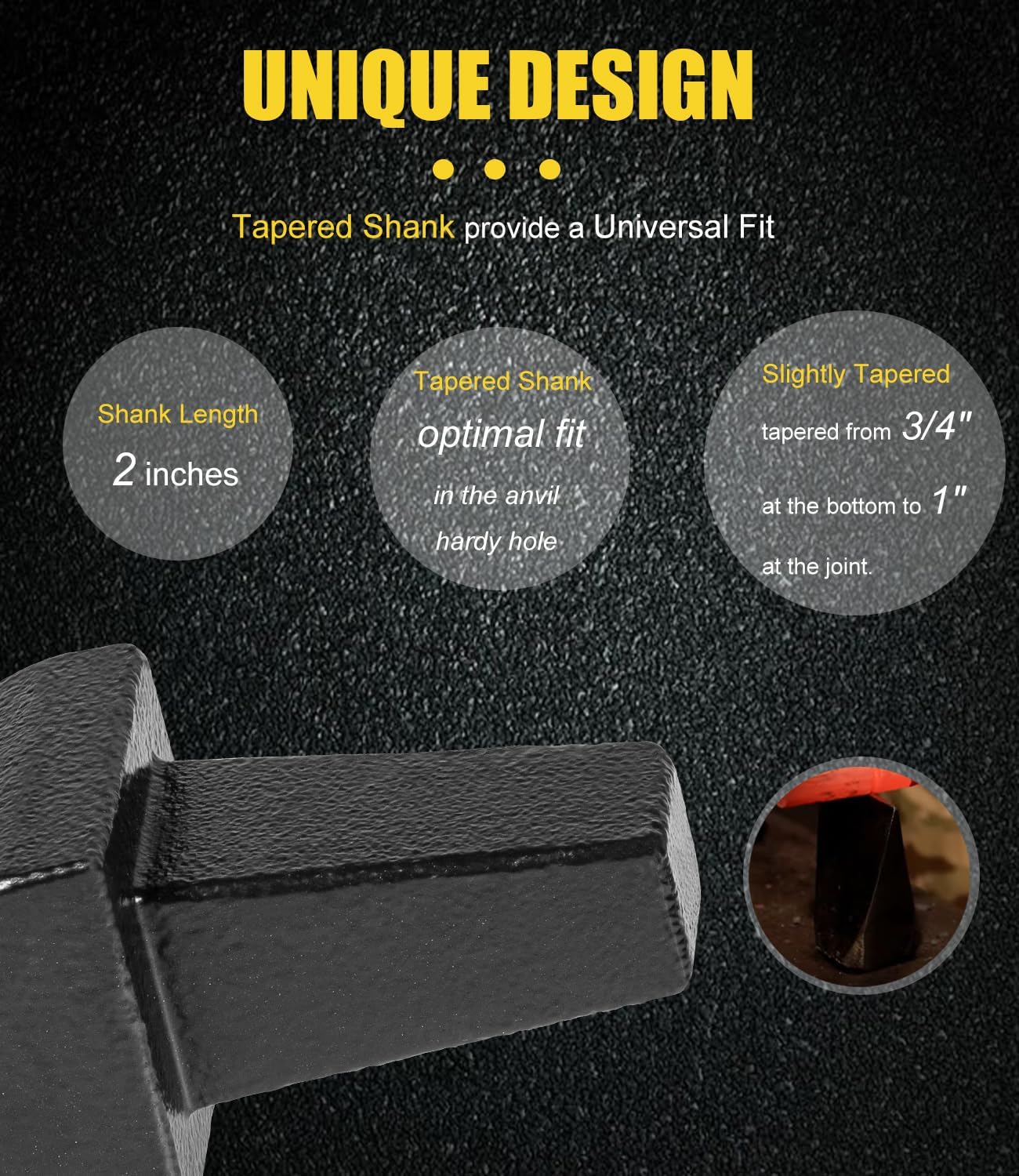 • Fitment -- This blacksmith anvil hardy tool's shank is 2" long and tapered from 3/4" at the bottom to 1" at the joint. Fits Hardy Hole of an anvil( it may require finishing to fit your anvil), or can be used in a vise. The shank is slightly tapered, for an optimal fit in the anvil hardy hole.
