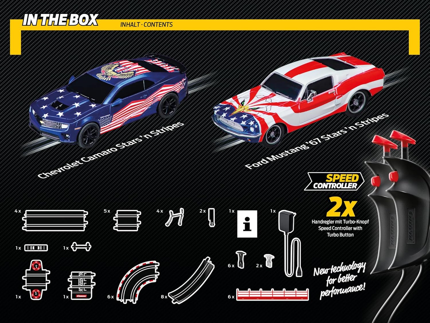The thrilling showdown of American muscle cars with the Carrera GO! "Street Legends" set two of the most famous muscle cars in history take the race track in the sights. On the 4.9 metre long track, the Ford Mustang '67 Stars 'n Stripes and the Chevrolet Camaro Stars 'n Stripes compete for a thrilling duel. The true-to-life vehicles make the heart of any racing fan beat faster and deliver a thrilling head-to-head race in which every turn and every straight is competitive until the last second. Rail elements such as loopings and tight curves require full concentration and lightning-fast reflexes of the pilots. With the hand controls and the turbo button, every ride becomes a fast-paced challenge that turns the living room into an exciting racing arena - always on the hunt for the best time.