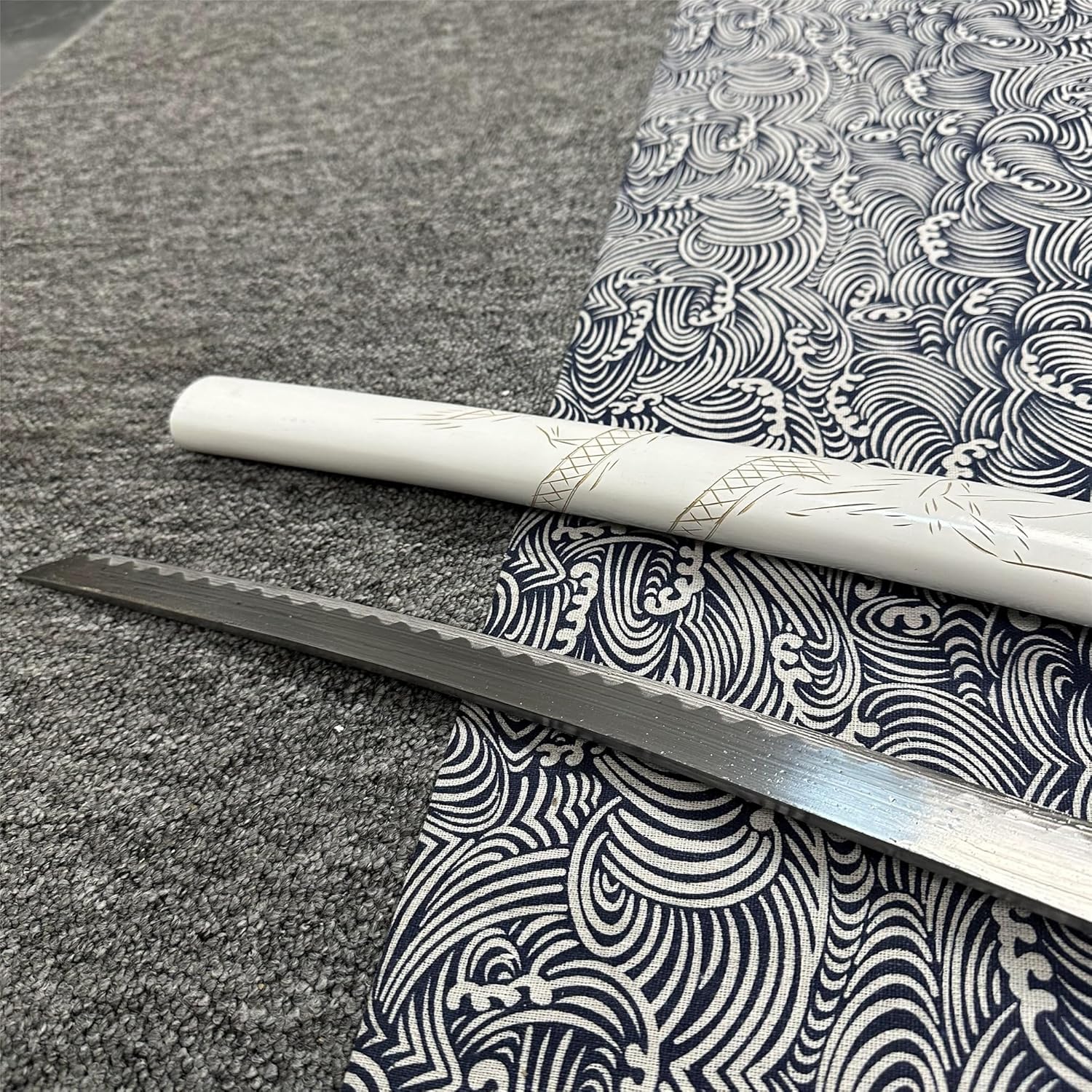 Add a touch of elegant artistry to your collection with this stunning 3-piece white katana sword set. Each sword features intricate traditional designs etched along the pristine white scabbards, complemented by classic diamond-pattern wrapped handles. The set includes three different sizes - a grand 39.3-inch long sword, a medium 31.1-inch sword, and a compact 20.4-inch sword, offering versatile display options. The swords come complete with a sleek black display stand that showcases all three pieces in the traditional stepped arrangement. The detailed craftsmanship is evident in every aspect, from the ornate etched patterns to the carefully wrapped handles. Perfect for collectors, enthusiasts, or as a striking decorative piece, this white katana set makes an impressive statement in any room. The included stand ensures proper presentation while protecting your collection. Please note these are decorative pieces intended for display purposes only.