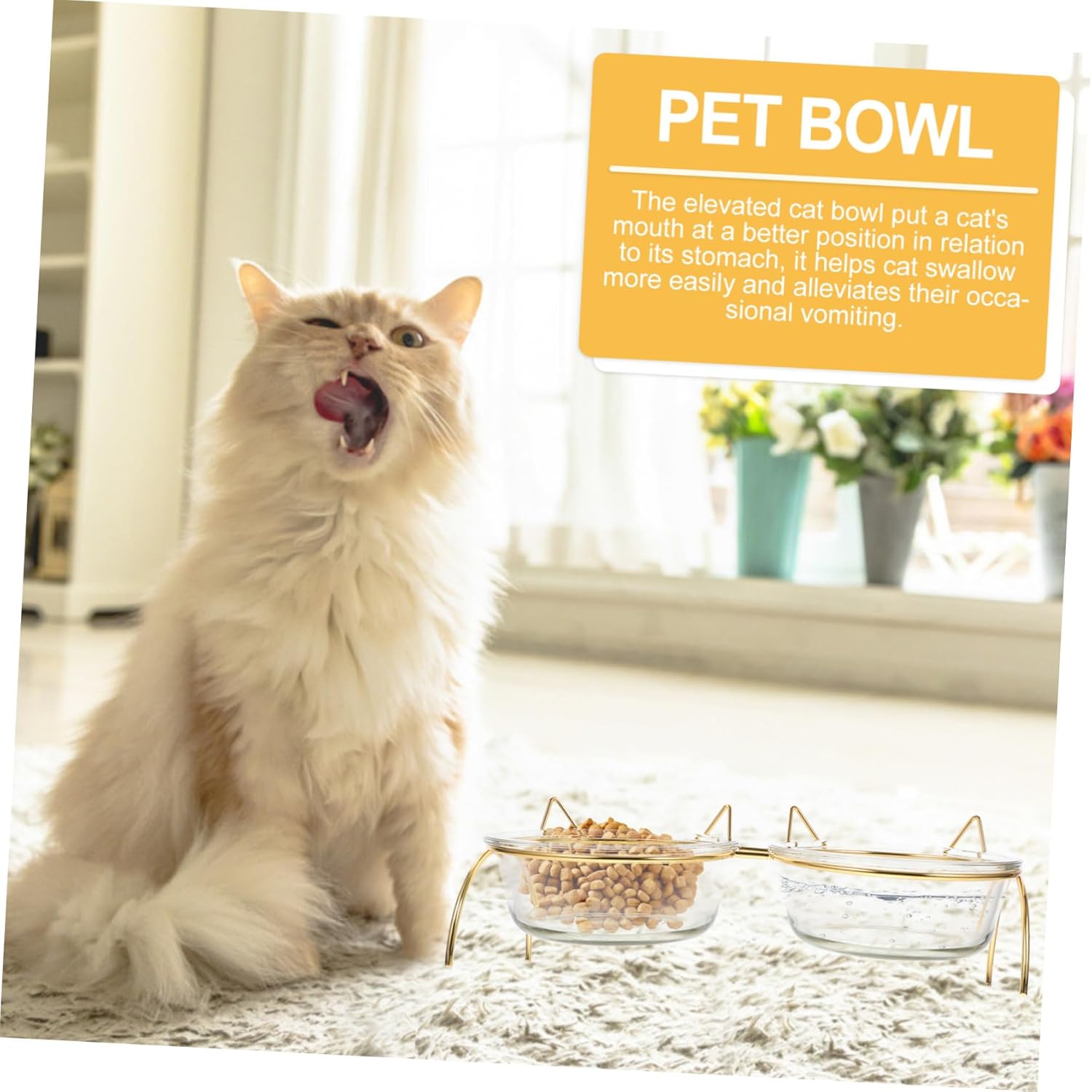 Package Include 1 2 x bowls 1 accessories Features -Product Info:Cat Bowl SetGoods InformationCat Food Feeder When your lovely cat is eating, its whole face can be properly placed in the bowl for a comfortable feeding session.Pet Feeder - The elevated cat bowl put a cat's mouth at a better position in relation to its stomach, it helps cat swallow more easily and alleviates their occasional vomiting.High Base Cat Bowl - Material: Glass, iron.Pet Bowl Feeder Help pet digest food easily, prevents frequent vomiting and reduce neck burden.Pet Drinking 's convenient for cats to eat.Pet Food Bowl The pet feeder bowl suits for all types of cats and small dogs.Pet Eating Bowl - Because of the tilt angle, food never gets caught in the back or the sides of the bowl.Cat Feeding Bowl Features - Color: Golden.Cat Ceramic Bowl - Your cats can eat and drink more comfortably, and don't need to strain his neck down.Pet Feeding Bowl Just enjoy his relaxing meal time!- The tilted bowl prevents the cat's beard from being pressed and makes him ease.Water Feeder - The perfect height of raised cat bowls reduce cat's neck burden