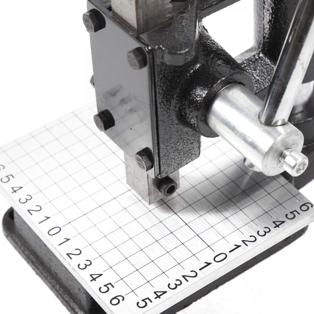Description: Toothed rack width: 22mmDie hole diameter: 11mm(M12 screw thread)Bottom plate big round hole diameter (feeding hole): 27mmDrill chuck clamping range: 1.5-13mmMax machine pressure( downforce): less or equal to 160 Kg.Features:1. Low operating noise2. With labor-saving spring3. Safe operation, machine stamping instead of beating prongs with a hammer3. With different accessories to achieve multi-function4. Quick installation and easy operation5. Max 160Kg of pressure (down force) to good stamping effectApplications:This machine is mainly aimed at leather handcraft workers, used for punching, pronging and stamping process, improving efficiency and working quality.Package:1 * Machine2 * Spanner1 * Drill chuck1 * PP plate1 * Aluminum plate with scale