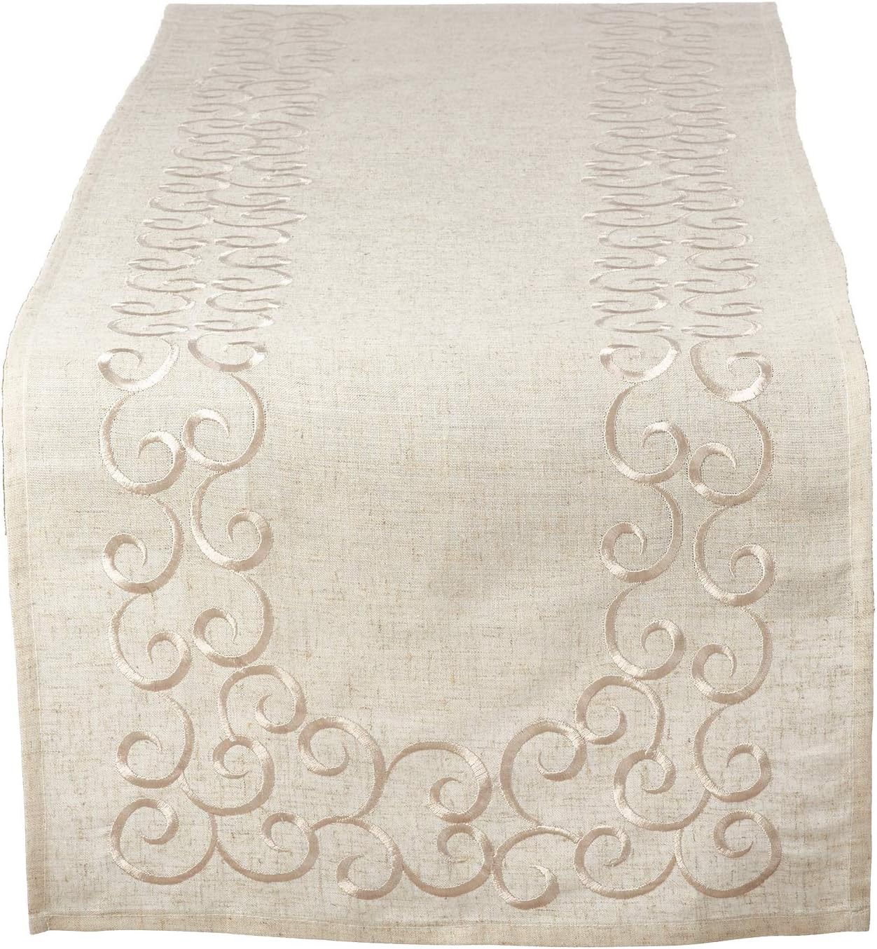 Classic Scroll Border Tablecloth:Brighten your tabletop with this embroidered tablecloth from by Fennco Styles. A touch of classic style and charm for any table, this tablecloth is made from a premium linen blend and incorporates an embroidered swirling scroll design along the border. While its solid hue may seem neutral, embroidered scrollwork details lend a dash of distinction and it is easy to coordinate and the impressively durable design creates a timeless and stylish addition for years to come.PRODUCT DETAILS :Dimensions: 67 x 120 inchMaterial: polyester and linen Care Instructions: dry clean onlyOur Philosophy:At Fennco Styles you can shop a carefully selected range of home, lifestyle and gift products. We believe our homes should be reflections of the journeys we take. Our personal spaces deserve designs with a soul, a story, and a purpose. Our lifestyle brand offers inspired living through high-quality products, exclusive designs, and timeless style. We aim to source ethically, looking for products that are made from sustainable materials and designed to last and seeking out Makers that are conscious of their impact on the environment.