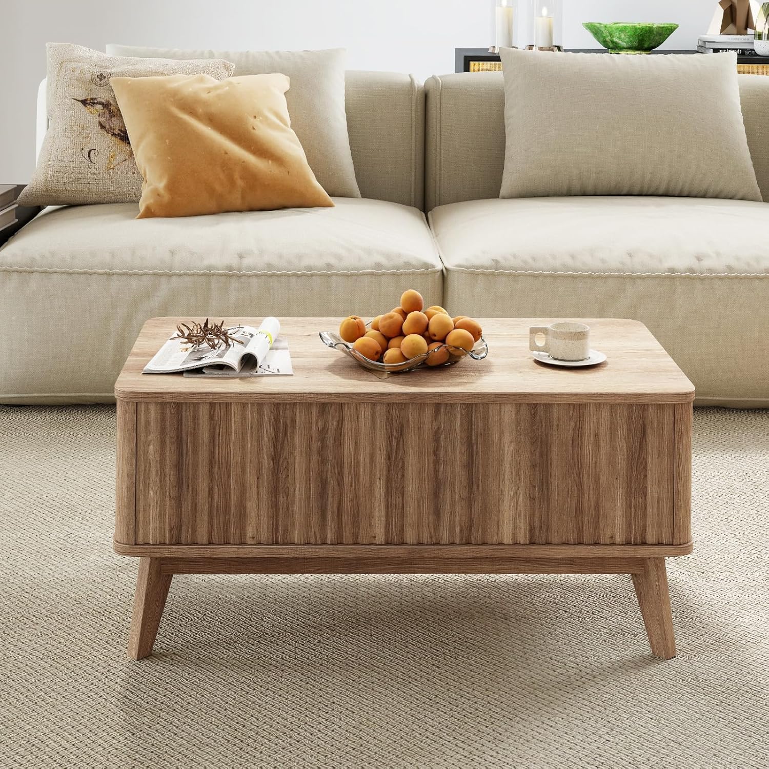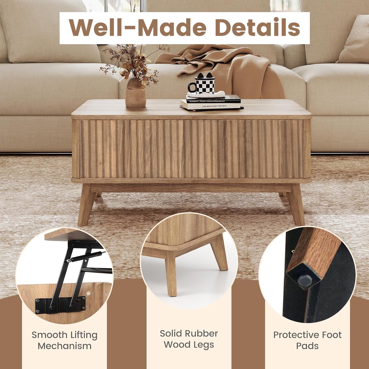 Description:Elevate your living space with one table, dual functions that seamlessly blend modern design and practical use. This versatile lift top coffee table features a smooth lifting mechanism that transforms the piece from a classic coffee table into an elevated work table or dining surface. Spacious enough for everyday needs, it serves as your perfect storage organizer with a wide tabletop and 2 hidden compartments. Highlighting well-made details, its sleek mid-century fluted design adds a tasteful retro charm that complements various decoration styles. Built with sturdy rubber wood legs, it supports up to 200 lbs on top and 180 lbs inside each compartment, with protective foot pads to prevent floor scratches. Measuring 43.5"/35.5" long, this adaptable lift top center table fits effortlessly in living rooms, home offices, or studies, combining style and dynamic functionality for modern households.Features:Lift-top tabletop with a smooth lifting mechanismDesigned with a spacious tabletop and hidden compartmentsInner divider ensures separate storage space for neat categorizationSolid rubber wood legs provide strong supportEquipped with protective foot pads to avoid accidental scratchesUnique fluted surface to bring timeless mid-century charmVersatile table works as a coffee table or work tableNote: The coffee table requires assemblySpecifications:Color: WalnutMaterial: Rubber Wood, MDFOverall Dimensions (Closed): 43.5" x 20" x 16.5"/35.5" x 20" x 16.5" (L x W x H)Overall Height (Opened): 22"Inner Size of Each Compartment: 20.5" x 18" x 8"/18" x 16.5" x 8" (L x W x H)Height off the Floor: 5"Load Capacity of Tabletop: 200 lbsLoad Capacity of Each Compartment: 180 lbsNet Weight: 62 lbs/51 lbsPackage Includes:1 x Coffee Table1 x User Guide