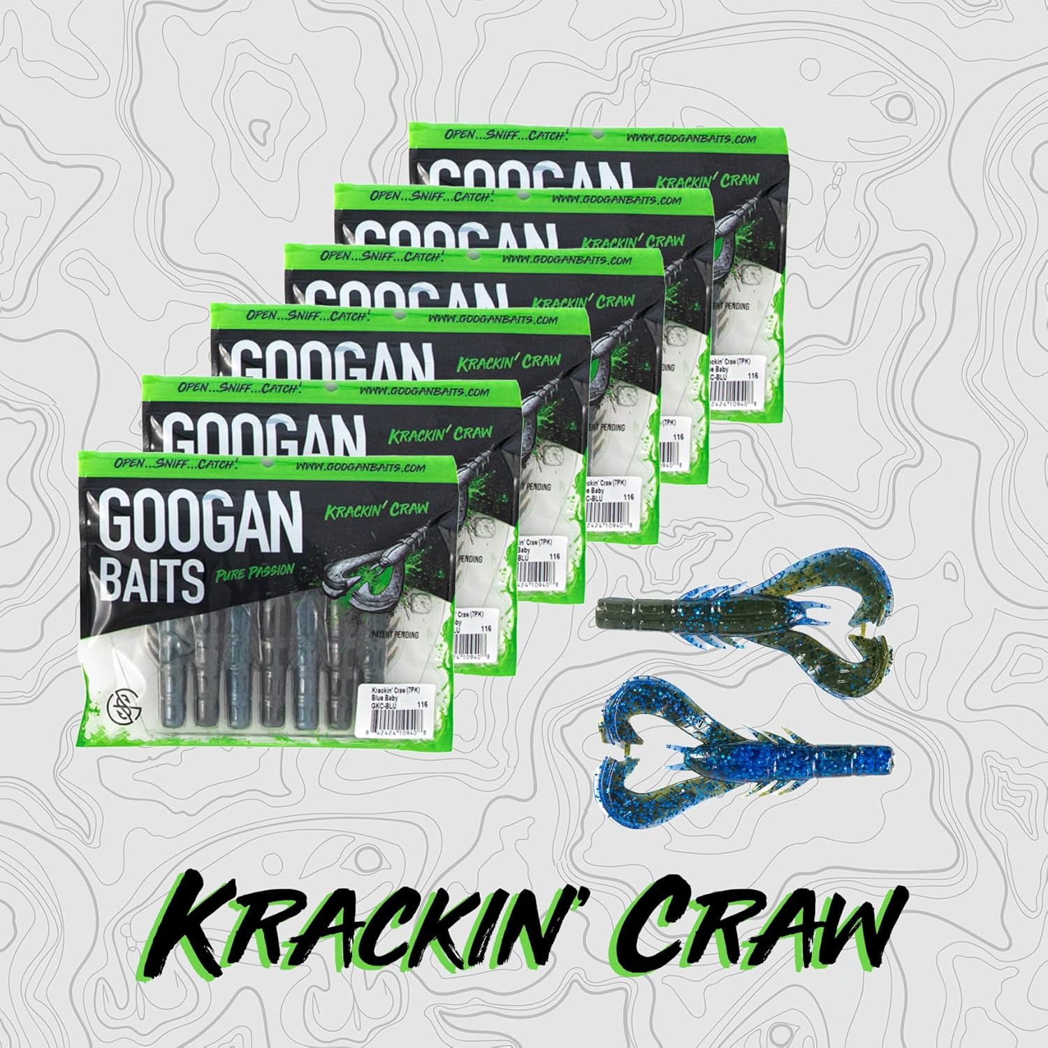 The Googan Squad Krackin' Craw is a purpose-built crawfish imitation soft plastic bait designed to catch bass when other lures fall short. Featuring patented V-Ridge Double Flange claws that create intense kicking action and maximum water displacement, this crawdad bait triggers aggressive strikes from largemouth, smallmouth, and spotted bass. The segmented body serves double duty as a built-in guide for trimming to your ideal jig trailer size, making it one of the most versatile creature baits in your tackle box. Every Krackin' Craw is salt-injected for added weight and realistic feel, keeping fish committed to the bite longer for more confident hooksets. Infused with Googan Squad's signature Slaunch Sauce scent, this soft plastic crawfish bait delivers the flavor and action that bass simply cannot resist. Whether you are flipping matted grass, pitching to laydowns, or dragging a jig along rocky bottom, the Krackin' Craw is engineered to perform.