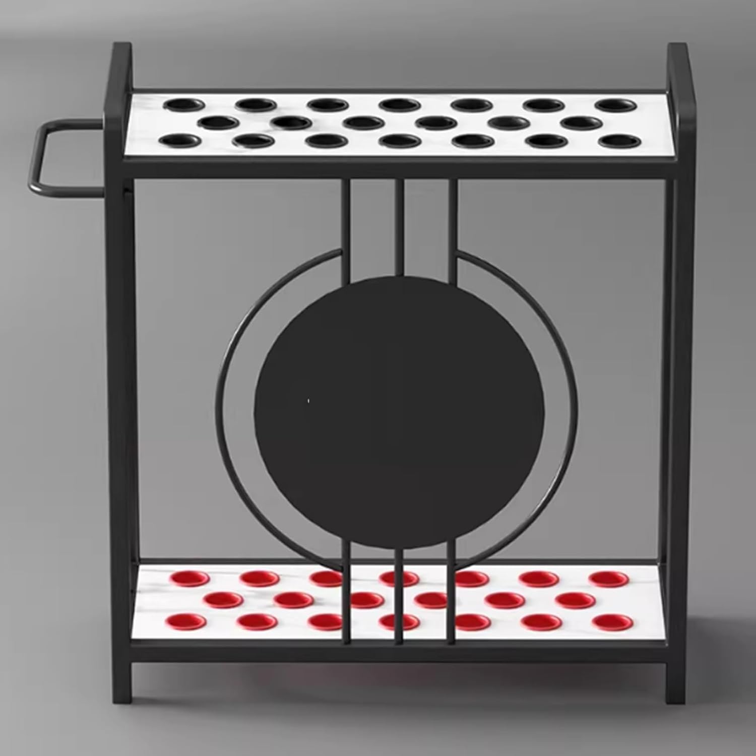 Transform your game area with our sleek and functional Pool Cue Stick Holder, designed to enhance your billiards experience while maintaining an organized space. The innovative tiered design features multiple perforations, allowing for efficient storage of cues and balls, ensuring everything is neatly arranged and easily accessible.Key Features:1. Elegant Design - This stylish pool cue rack adds a touch of sophistication to any game room. With a selection of colors available, you can easily match it with your décor and create an inviting atmosphere for you and your guests.2. Space-Saving Solution - Perfect for compact areas, this holder keeps your game essentials organized. It's not just for pool cues; use it for ping pong paddles, racket brushes, and various game items, helping you maintain a tidy environment.3. Robust Construction - Built with a reinforced metal frame, this holder can support up to 100kg, ensuring stability even when fully loaded with cues and balls. Its durability promises long-term use without deformation, making it a reliable addition to your game room.Product Specifications:- Product Name: Pool Cue Stick Holder/Floor Stand Billiards Pool Cue Rack- Materials: Iron frame and rubber ring- Colors Available: Black, Gold- Suitable For: Home, Bar, Kitchen, Bathroom, HotelPackage Includes: 1 x Pool Cue Stick HolderImportant Notes:- The package includes only the Pool Cue Stick Holder; other decorative items shown are not included.- Please allow for a slight measurement variance of 1-2 cm due to manual measurement.- Colors may vary slightly from the images due to differences in monitor settings and lighting conditions.Elevate your game with our Pool Cue Stick Holder, where style meets practicality.