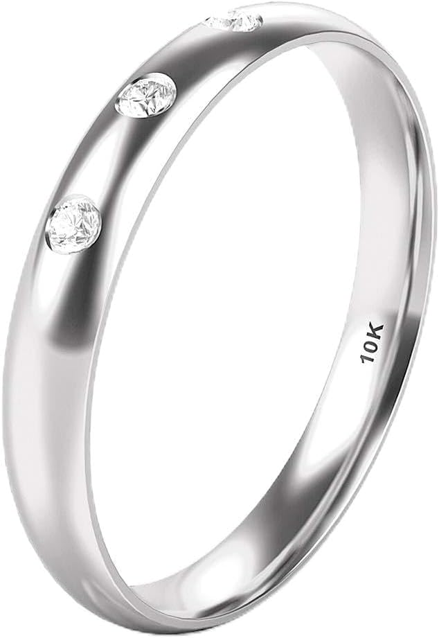 This classy 10k solid gold wedding band ring has 3 round brilliant diamonds in bezel settings which weighs 0.015 carats each. It measures 3mm in width and has a high polish mirror-like shiny finish on the surface. It comes in an elegant ring box and it has a 10k stamp on it to indicate its authenticity. It never tarnishes or turns color.