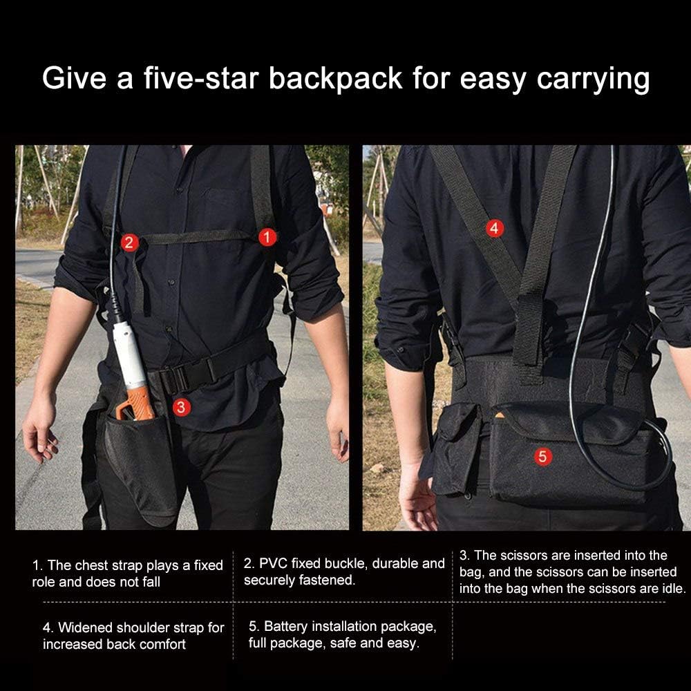 Electric pruning shear parameters:1. Maximum shear diameter: 45mm. Opening size 3 cm and 4.5 cm switchable2. Power: 450w3. Scissors weight: 1kg4. Lithium battery: 36V4.4Ah / 144Wh5. Battery weight: 1.3kg6. Use time: 8-10 hours7. Charging voltage: 110~240vElectric fruit branch cutting range: 30MM diameter hard branches (hard branches: holly, boxwood, cypress, juniper, crape myrtle, tea tree, etc.) to 45MM soft branches (soft branches: grape branches)The basic composition of electric fruit scissors:1, electric scissors 2, battery 3, charger 1 4, power cord 1.5 meters long5, battery backpack 6, a set of maintenance and adjustment tools 7, toolbox and random filesThe characteristics of the electric fruit branch shear are as follows:1. Non-abrasive blade, made of tungsten steel, durable.2. Low noise, good fatigue resistance, 8-10 hours of continuous work every day3. Can be widely used in various fruit tree garden production areas.4. Reduce the labor intensity of workers (scissors) and new measures to strengthen labor protection.5. Electric scissors work efficiently, reducing the number of workers and reducing production costs.6. Flexible use, easy to turn, safe and reliable, easy to maintain, easy to replace the blade.7. Upper blade, follow-up blade can also be purchased separately if needed.If you are a professional fruit tree pruning practitioner, please:You can double the trimming efficiency and increase the profit of trimming.2, the real realization of relying on technology and advanced equipment to make money, rather than relying on physical strength to run.3. After the trimming operation, the fingers and arms will not be painful for a long time, so you can continue to live easily.