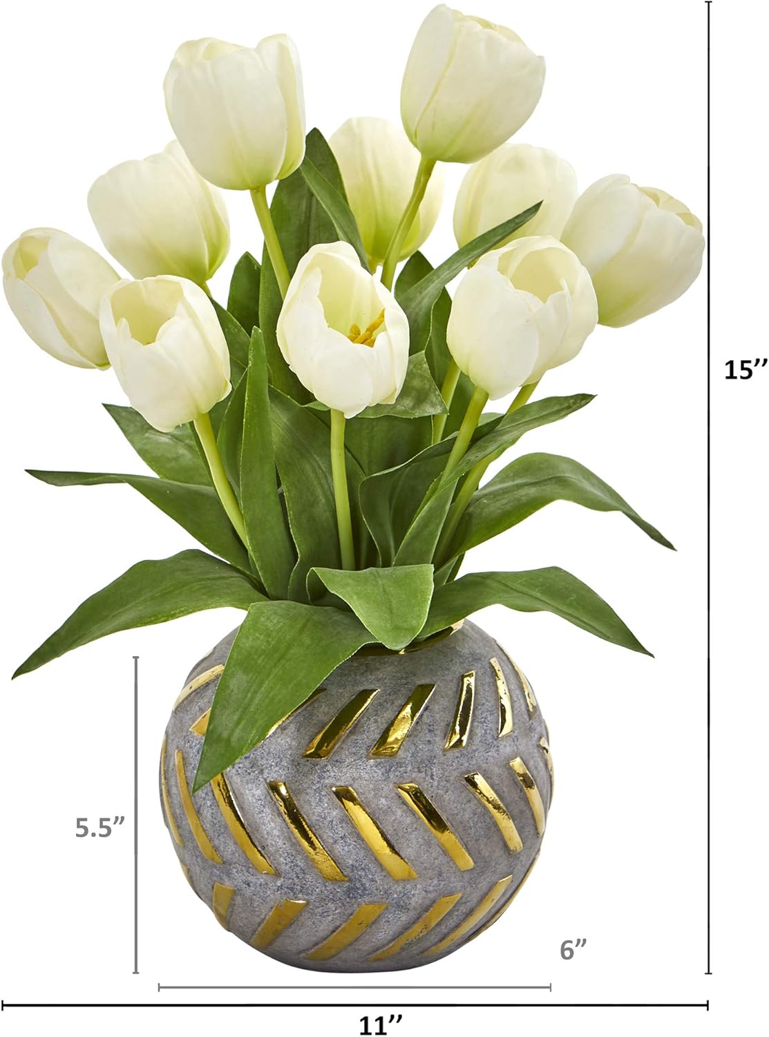 Incorporate spring coloring year-round with this arrangement of artificial tulips boasting bright cheerful blooms, handsomely complemented with dark, realistic leaves. Reaching 15” high from a decorative vase, it makes for an enchanting accent all year round.
