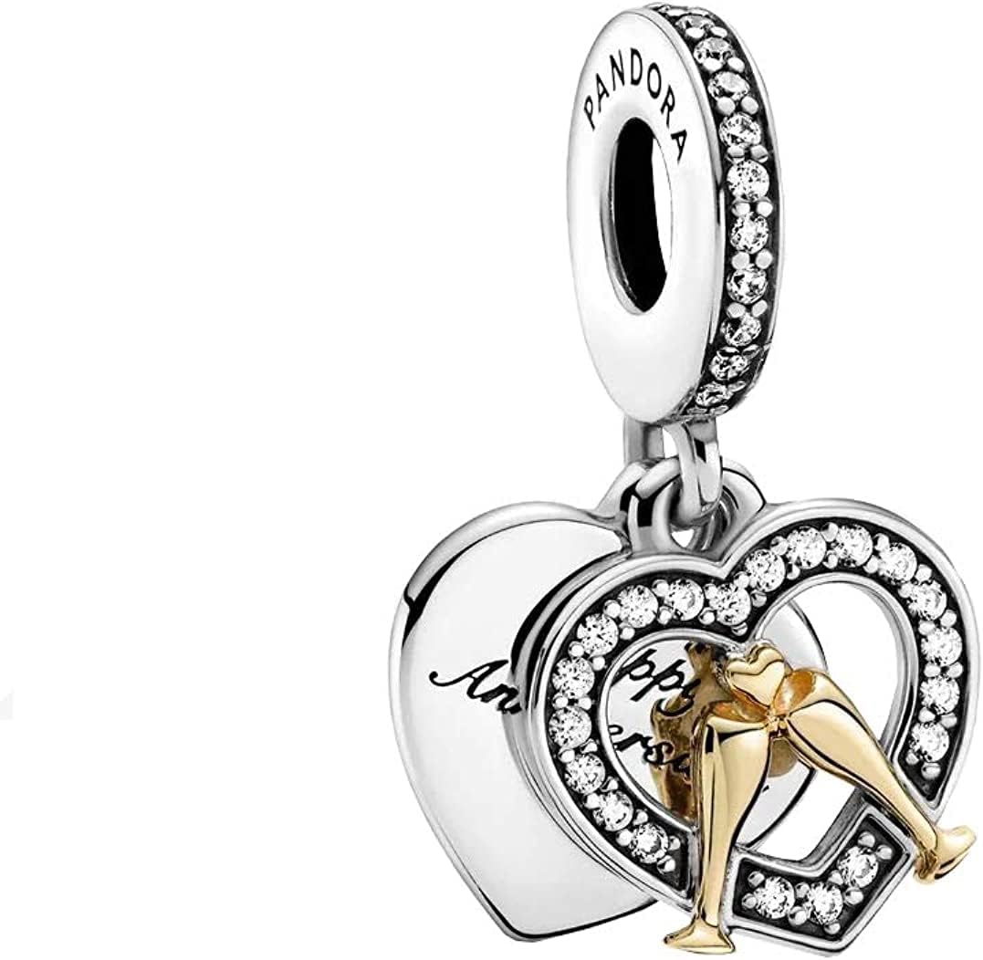 Celebrate your lasting love with the Two-tone Happy Anniversary Dangle Charm.Hand-finished in sterling silver and 14k gold this heart charm features two 14k gold toasting glasses inside a heart-shaped Pave-lined frame as well as a heart-shaped back disc with a Happy Anniversary engraving.The bail features a Pandora logo and row of sparkling Pave.Let this sparkling silver and 14k gold charm serve as a reminder of your love and shared memories - past present and future.