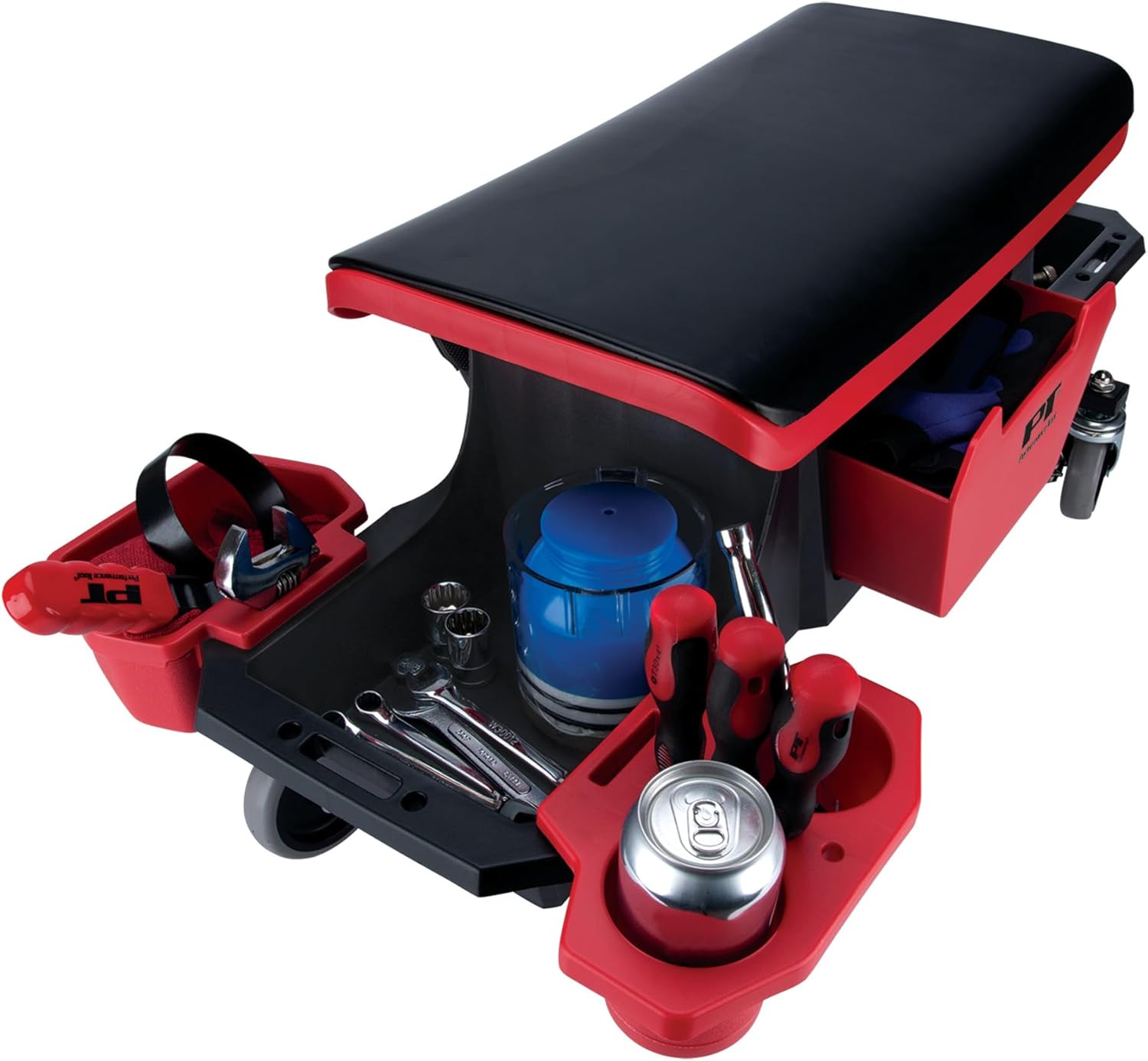 The Performance Tool Heavy Duty Mechanics Seat is designed for maximum strength and stability, featuring a reinforced injection molded body with rectangular steel supports that extend beyond the seat. This mechanics seat also boasts ample storage space, with two large integrated side storage trays, an oversized removable storage drawer, and three removable side trays that can hold all your tools, cans, bottles, rags, parts, and other gear. The 4-inch rubber coated swivel casters provide a smooth ride over uneven surfaces, cracks, and cords, while two locking casters keep the seat in place. With an oversized 19-inch seat featuring a vinyl foam cushion for added comfort, this mechanics seat allows you to work for longer periods without feeling fatigued. Plus, the included moveable trays can be placed in any of the six slots on all three sides of the cart, making it easy to store screwdrivers, wrenches, pliers, cans, nuts/bolts, and more.