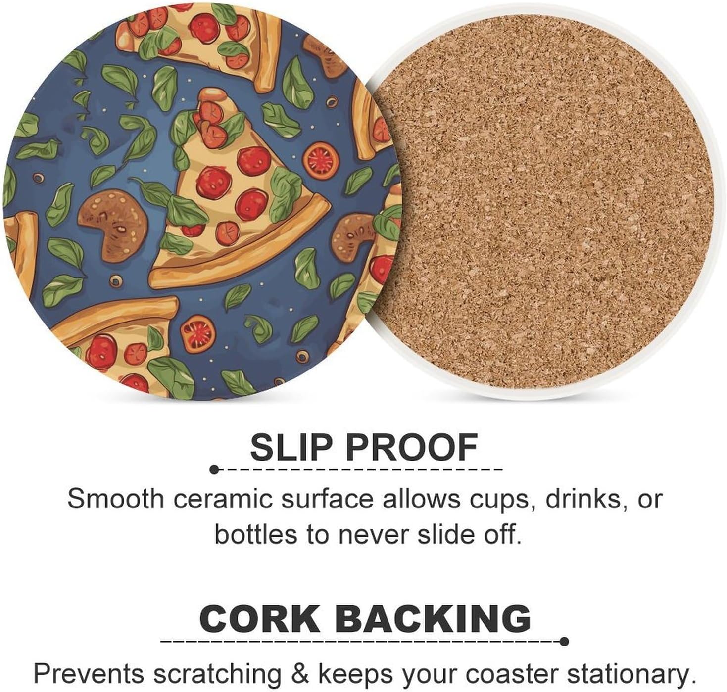 Introducing our ceramic coaster, a practical and elegant addition to your home and office that combines functionality with simple charm. Crafted with premium ceramic, this coaster features a smooth and sleek surface that not only looks exquisite but also effectively insulates heat, keeping your desktop away from the damage of hot drinks. The added cork bottom is carefully designed to prevent direct contact between the ceramic and the desktop, avoiding scratches and wear on your valuable furniture, while also enhancing friction to keep the coaster and cup stable without slipping.With its universal size, the ceramic coaster is suitable for various cup types in daily life, whether you are enjoying a cup of hot coffee in the morning, a cup of warm tea in the afternoon, or a glass of cool white wine in the evening, it can perfectly fit your cup and provide reliable protection. Unlike ordinary coasters, our ceramic coaster is easy to maintain—any accidental spills can be wiped clean in seconds with a damp cloth, no tedious cleaning steps required, saving you time and energy.This ceramic coaster is not only a practical daily necessity but also a subtle decorative piece. It is suitable for decorating your kitchen, living room, bedroom, office, dining room and bar, adding a touch of simplicity and elegance to any space. Whether for personal use or as a small gift for friends and family, the ceramic coaster is a perfect choice that combines practicality and aesthetics, bringing convenience and beauty to your daily life.