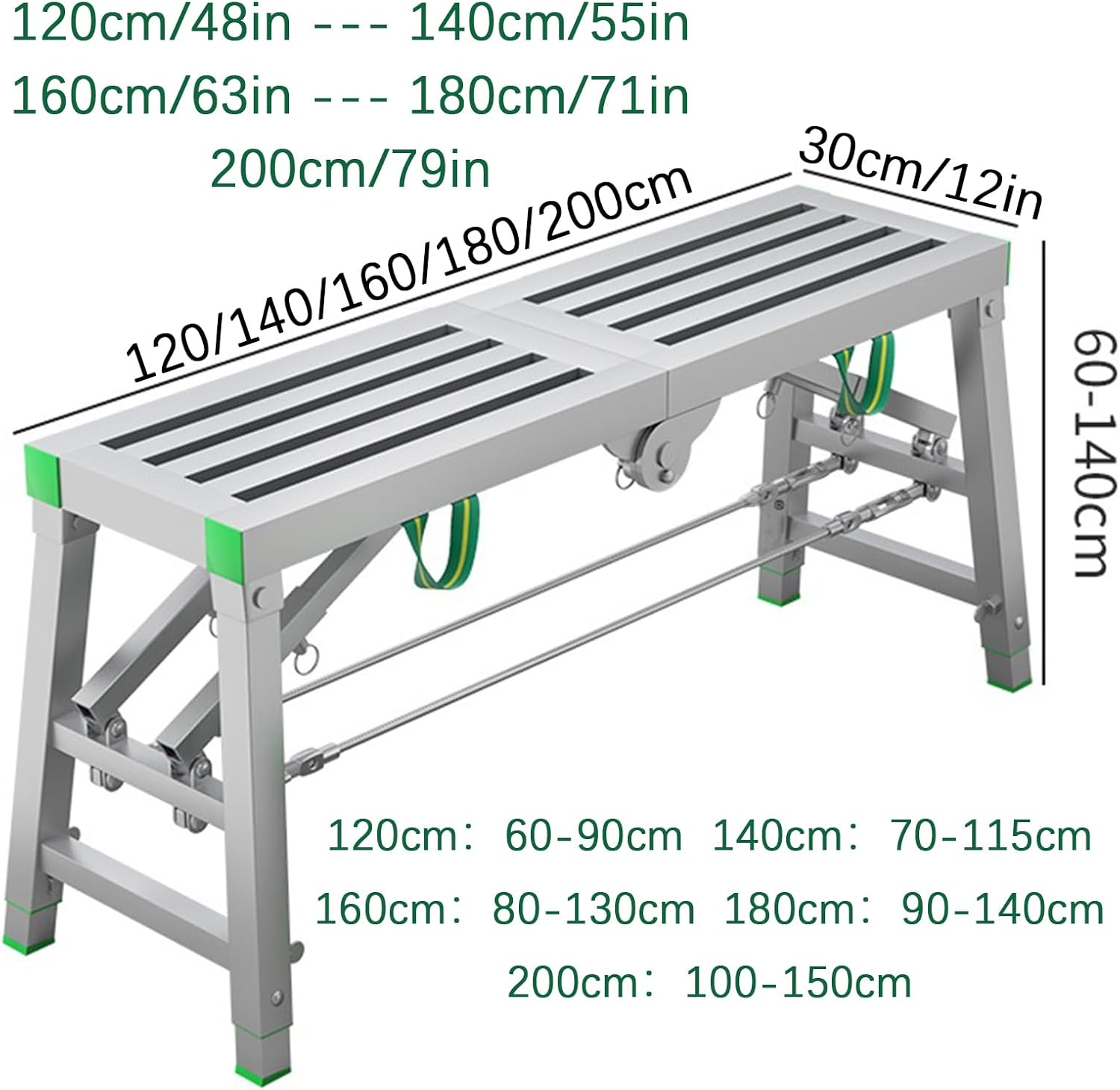 The novel and unique design combines the various functions of scaffolding and ladders, portable folding scaffolding equipment, and an adjustable-height multi-purpose work platform. It is not only ideal for washing vehicles, but also ideal for painting walls and cleaning windows. It can also help you access those out-of-reach items in cupboards or serve as a picnic table. Start working quickly and save time with no installation required.Product specifications✔ Name: Adjustable working platform ladder✔ Color: silver✔ Material: galvanized steel pipe✔ Product Usage: Home decoration, DIY, lifting things, painting walls, general repair work.Product Size✔ 120cm: Length: 120cm; Width: 30cm; Adjustable height: 60-90cm;✔ 140cm: Length: 140cm; Width: 30cm; Adjustable height: 70-115cm;✔ 160 cm: Length: 160 cm; Width: 30 cm; Adjustable height: 80-130cm;✔ 180 cm: Length: 180 cm; Width: 30 cm; Adjustable height: 90-140cm;✔ 200 cm: Length: 180 cm; Width: 30 cm; Adjustable height: 100-150cm;packing list✔ 1x folding scaffoldingAfter-sales service✔ Warm reminder: Since the scaffolding is welded from galvanized steel, there will be welding marks. If you mind, please do not place an order.✔ If you have any issues with the folding scaffolding you purchased, your satisfaction is our top priority. Our team will provide you with the perfect solution within 24 hours.