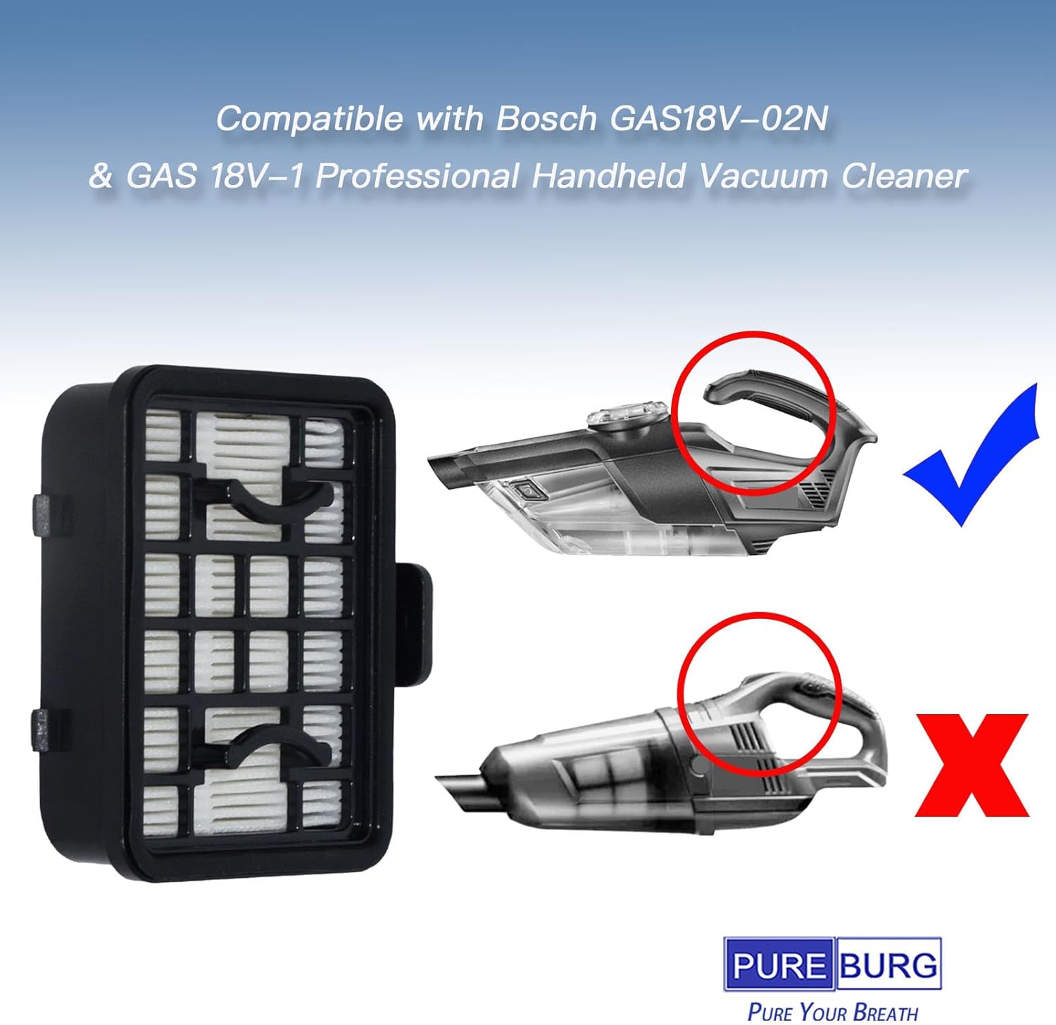 Keep your Bosch 18V handheld vacuum cleaner performing at its best with PUREBURG replacement HEPA filters. Specially engineered for the Bosch GAS18V-02N & GAS 18V-1 Professional model, these filters are built to deliver reliable performance and long-lasting durability. Each filter provides high-efficiency particle capture, helping to trap fine dust, dirt, and everyday debris during cleaning. By replacing the filter regularly, you can maintain strong suction power and extend the overall service life of your vacuum cleaner. Crafted from premium materials, PUREBURG filters are easy to install and designed for dependable use. With a convenient 4-pack, you’ll always have a fresh replacement ready when needed—perfect for both home and workshop environments. Disclaimer: This product is a generic item that is designed to replace the original part. Any brand names or logos are the registered trademarks of their respective owners. Any use of any brand name or model designation for this product is made solely for purposes of demonstrating compatibility. . PUREBURG - Pure Your Breath! We value your satisfaction. If you have any problems using our product, please always contact us.