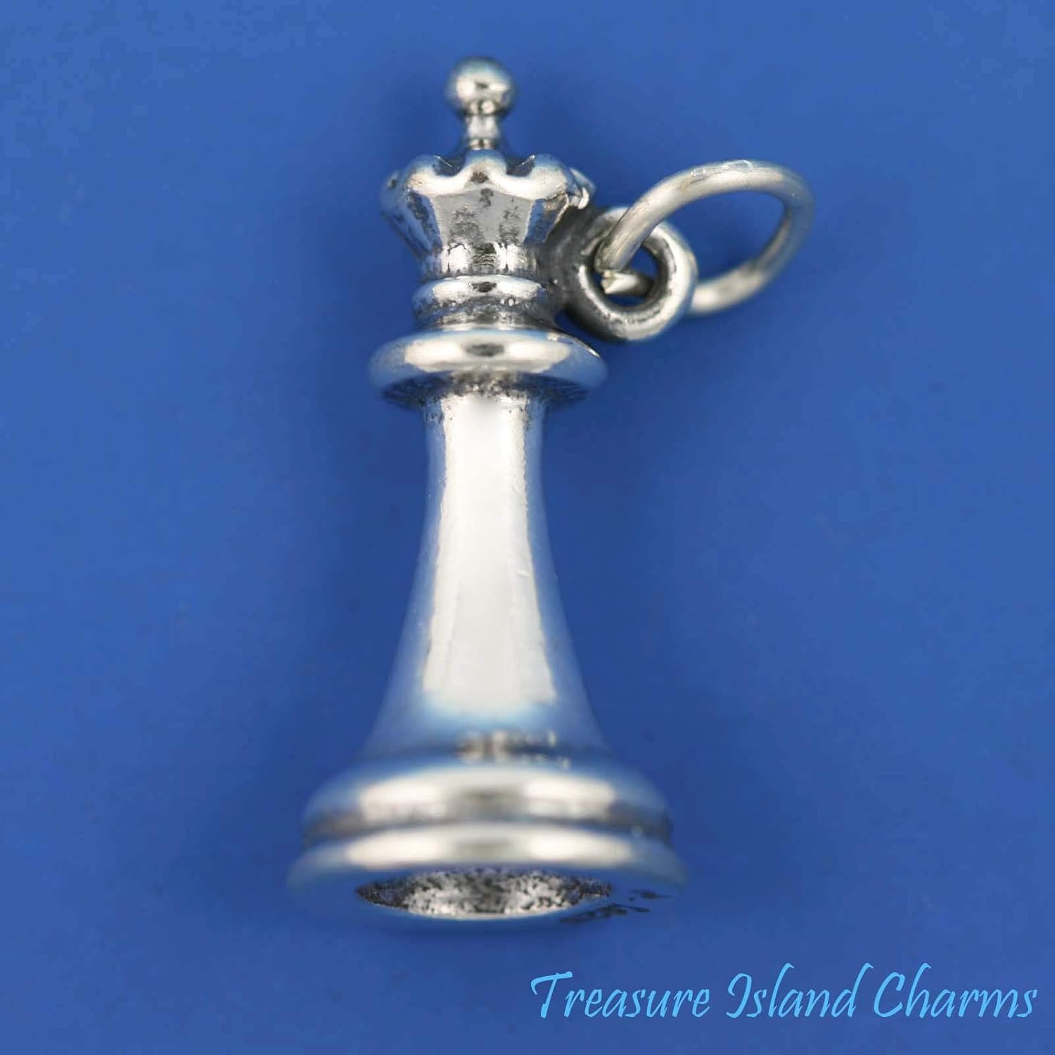 Queen chess piece 3D .925 solid sterling silver charm. The charm is hallmarked, it comes with a 6mm sterling silver keychain/split ring, and can fit a traditional charm bracelet or a chain necklace.