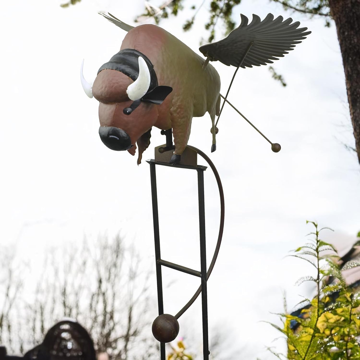 Showcase wildlife elegance with this flying buffalo kinetic garden stake. Its 57-inch tall design features a bold buffalo topper measuring 19.5 x 23 inches with a 28-inch wingspan. Crafted from durable metal with an H-bottom stake, it’s ideal for wide-open yards, ranch settings, or rustic landscapes. Watch as the wings glide and dip gracefully in every breeze. A beautiful gift for any occasion, be sure to look for other items and coordinating decor from Red Carpet Studios. Red Carpet Studios (RCS Gifts) is a USA- based business offering original designs in home and garden gifts and decor. With our Garden Studio Collections, RCS gives something special to everyone. In the Garden Studio, you will find everything from large scale spinners in our Wind Art, rustic planters for the gardener, and chimes and birdhouses for the nature and bird lovers.