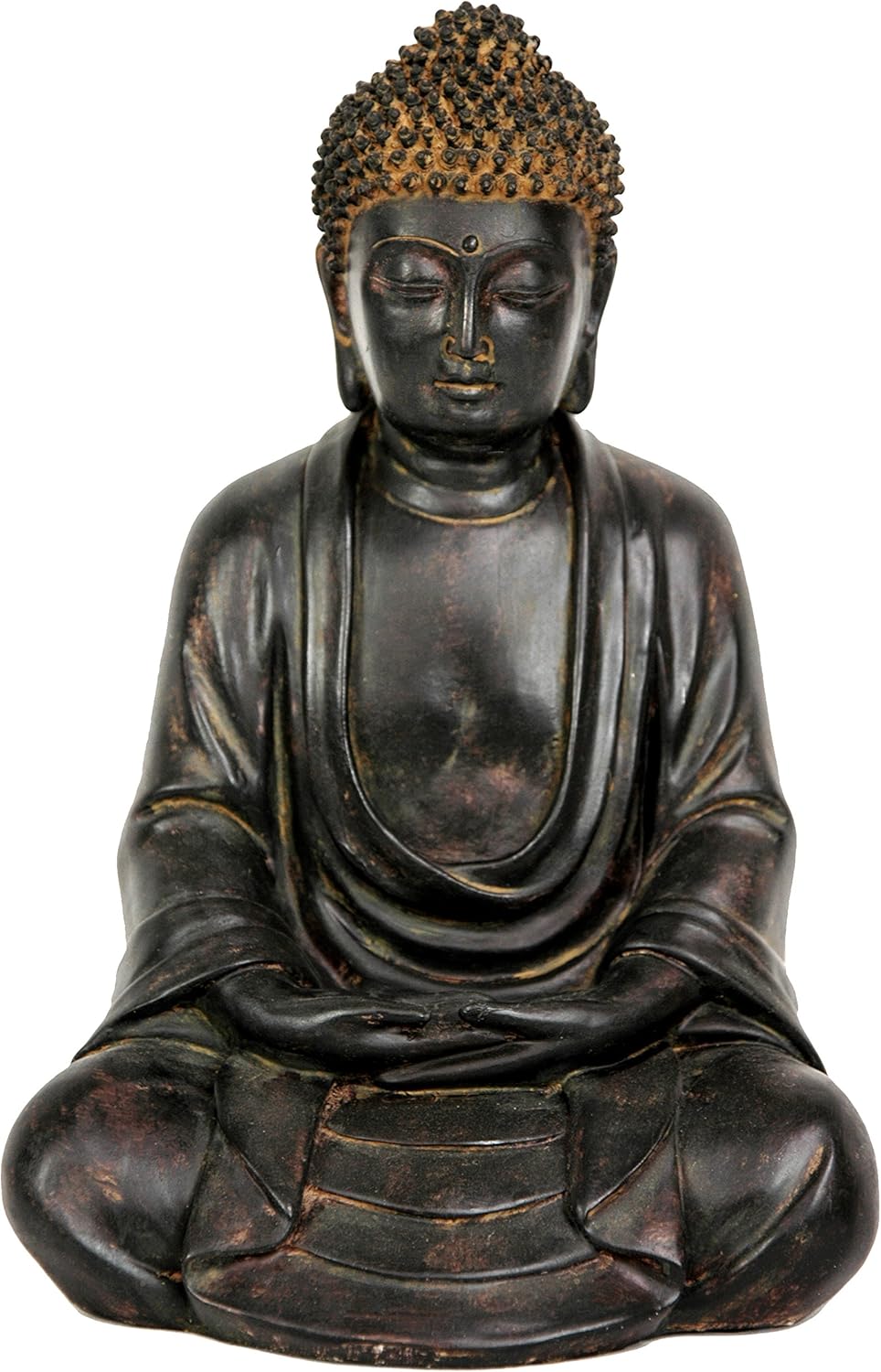 This high quality resin cast of an authentic Oriental statue depicts Shakyamuni--otherwise known as Siddhartha Gautama or simply the Buddha, quietly meditating. Seated in the double lotus position with his hands resting in his lap, this statue symbolizes peace of mind, concentration, and inner balance. The founder of Buddhism, Shayamuni is said to have meditated in this position for 40 days under the Bodhi tree before attaining enlightenment. Featuring a realistic faux patina and impressively sized at over two feet, this stunning statue will bring serenity and peace to your home, garden, or place of business.