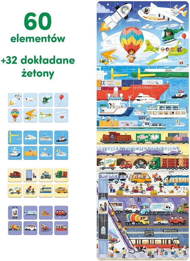 How the transport works manufacturer: 4+ packaging size: 16.5 x 19.5 x 5 cm. Assembly size: 23 x 66 cm. Set contents: 60 puzzle pieces, 32 picture chips, learning poster. The learning puzzle is a great gift idea for curious ego world of the preschool child. The little explorer in the box will find 60 puzzles, 32 pictures to refill and a poster full of curiosities about transport. Discover what rides, swims and flies by transporting people and goods. Playing with these puzzles develops small motor skills, perception and imagination.