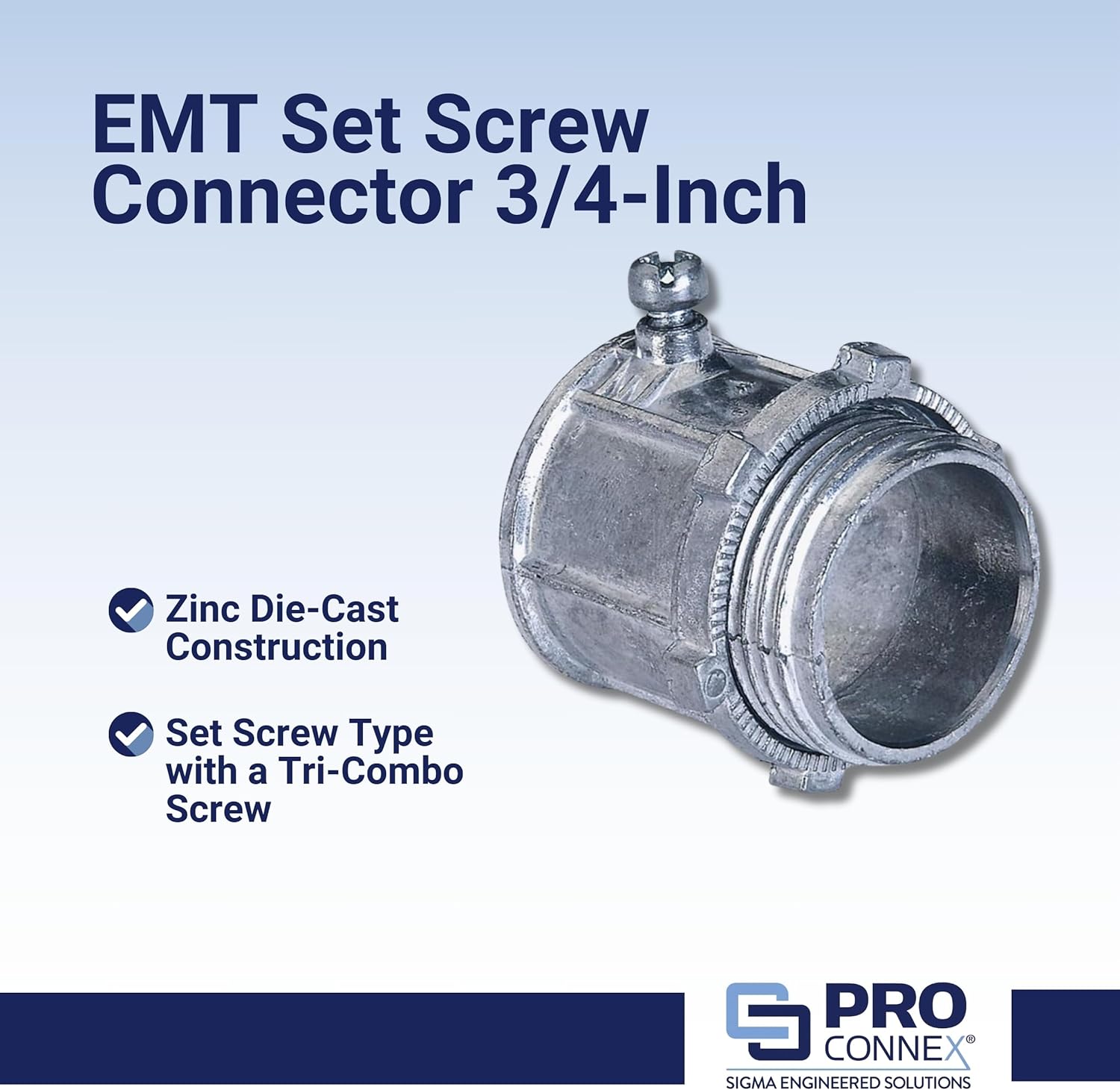 Upgrade your electrical installations with the Sigma Engineered Solutions ProConnex TC-502 EMT Set Screw Connector, available in a convenient 25-pack. This connector effectively terminates 3/4-inch EMT conduit to a 3/4-inch knockout in an outlet box or enclosure, providing secure and reliable electrical connections. Featuring a set screw type design with a tri-combo screw, it ensures easy installation and a tight grip.The zinc die-cast construction ensures durability and long-lasting performance, and is concrete-tight, when taped. With UL and CSA listings, this product meets safety standards and ensures peace of mind.