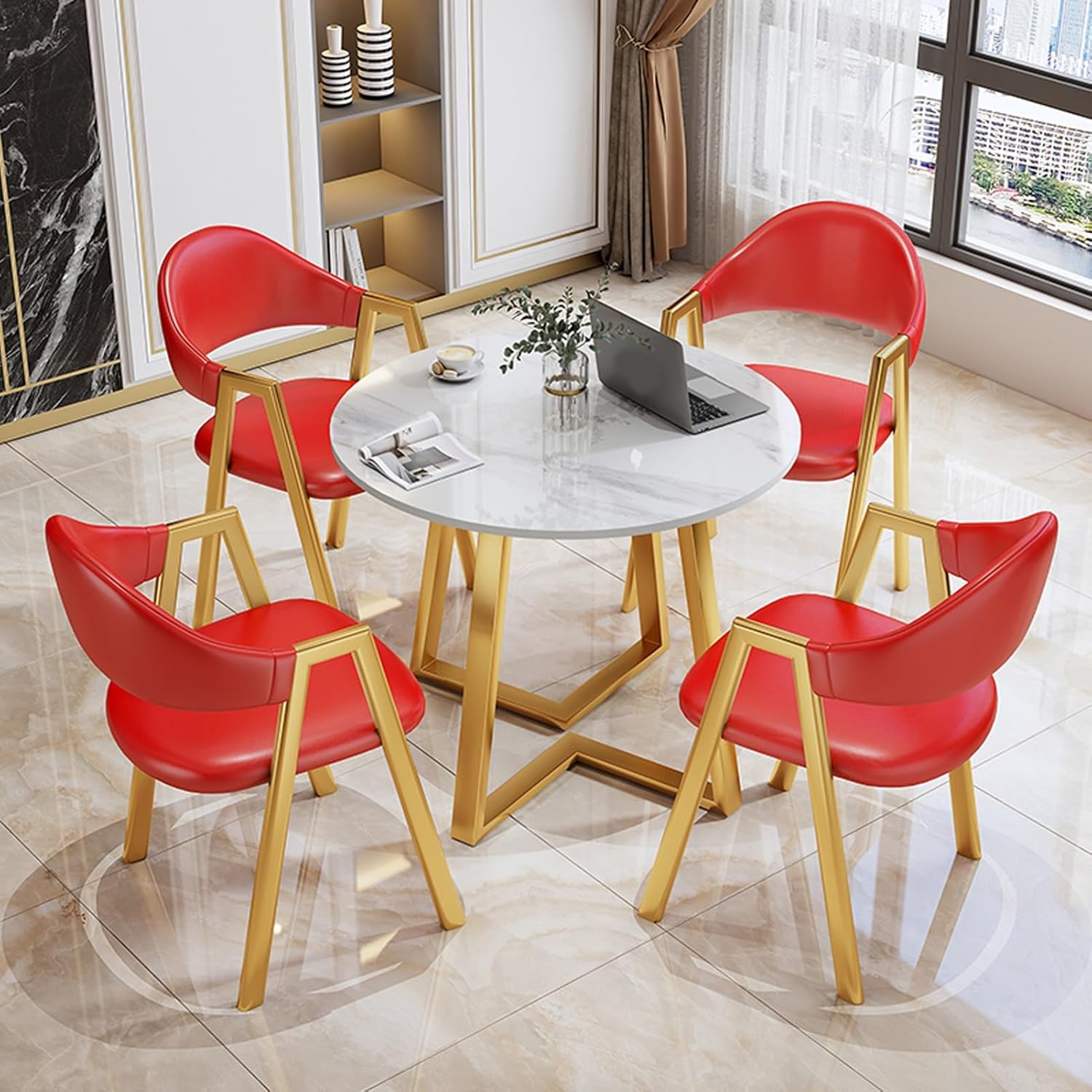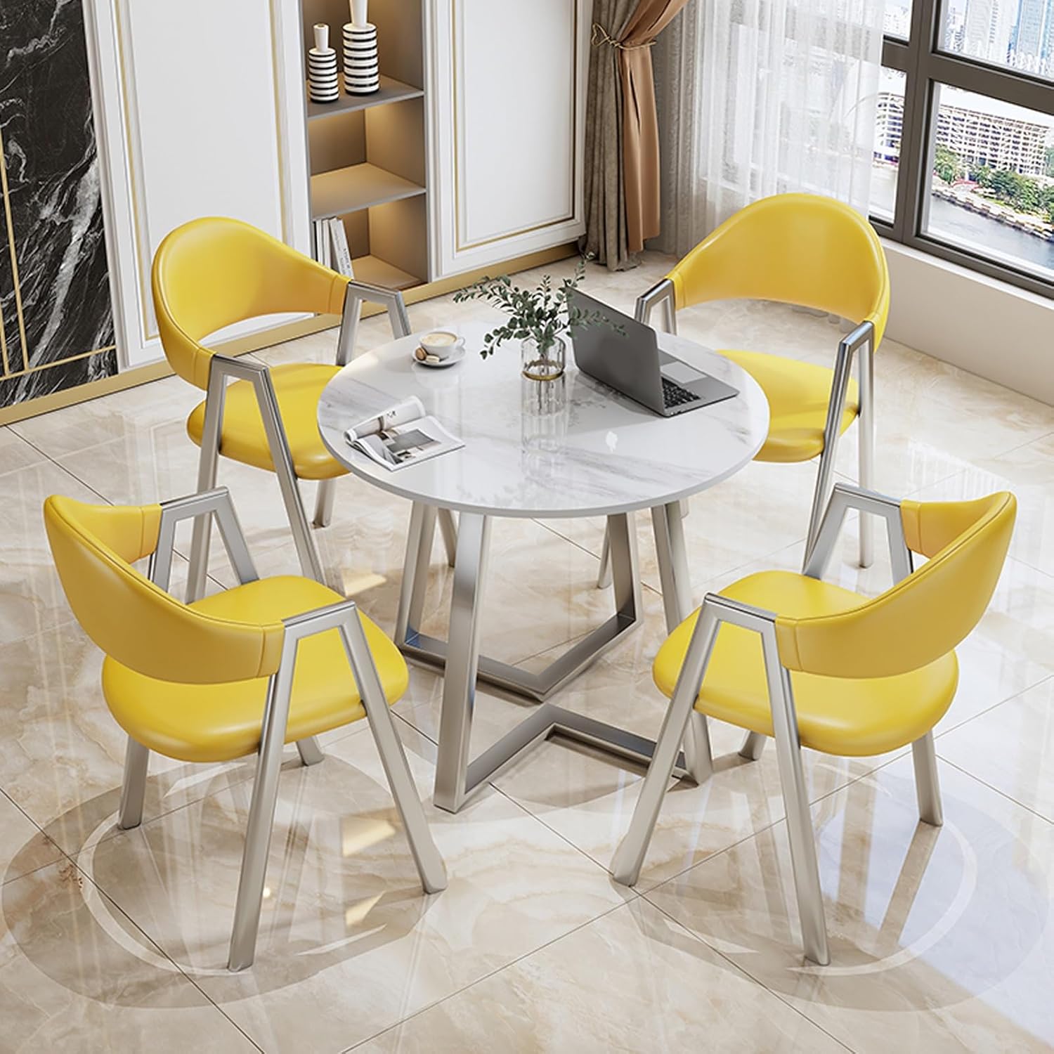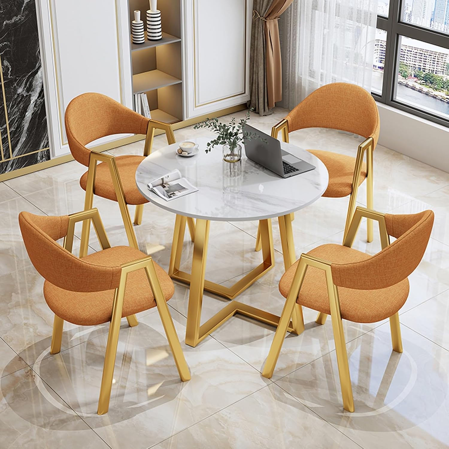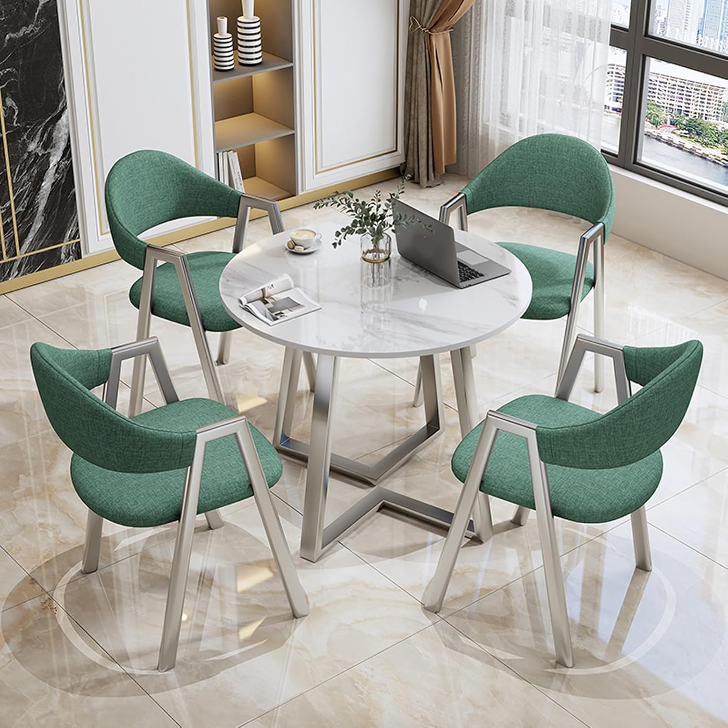 Coffee Shop Leisure Table and Chair Combination,at Office Reception Room, this Office Table and Chair Set can also be used as a small dining table in the kitchen or as a small conference table in the office.Product Parameters:Product Name: Office Reception Room Club Table and chair combinationBracket structure Material: MetallTable shape: RoundDesk top material: rock slabTable top diameter:80cm/31.4in(Can be customized in diameter 27.5in/70cm, 35.4in/90cm)Chairs material: PU leather/Cotton and linen fabricsApplicable number: 4 peoplePacking method: assemblyPacking list:1*table,4*chairs (other things are decorations, not included)Warm Tips:1. Size Description: The product is completely measured by hand and may have an error of 1-3 cm. Please refer to the actual items received.2. Picture description: The product is real. Due to problems with light, angle, display, etc., there may be slight chromatic aberration, please forgive me.