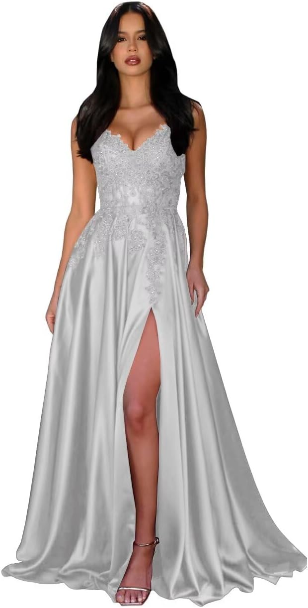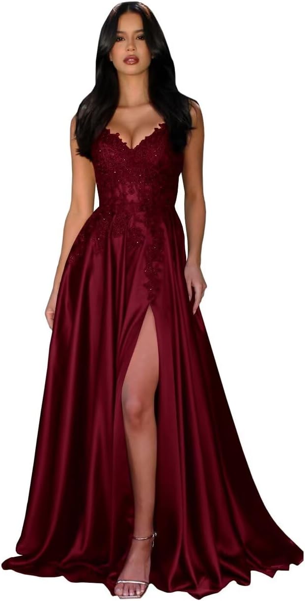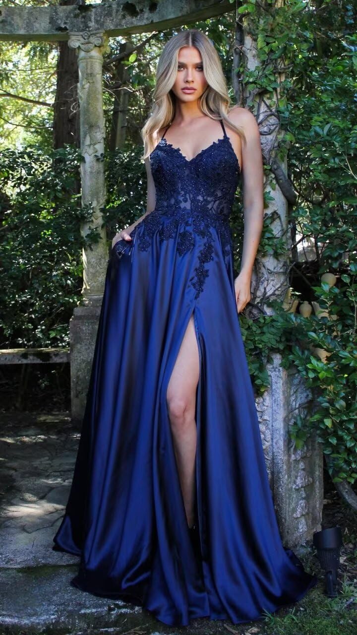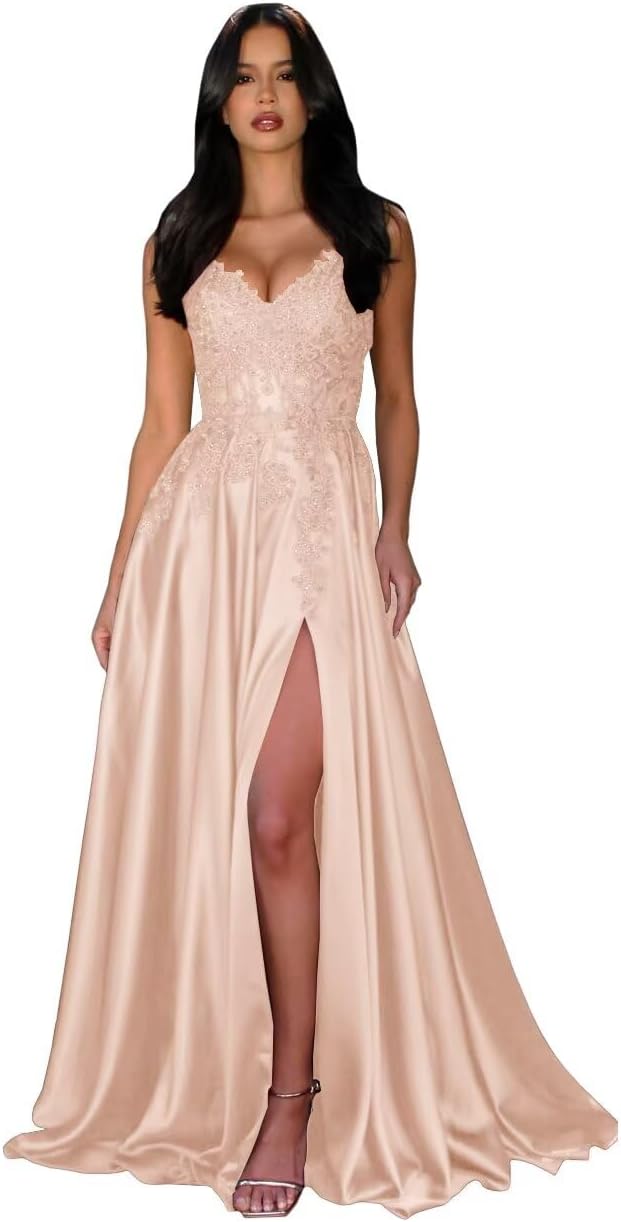 | Fabric Type | Long Lace Appliques Satin Spaghetti Straps V Neck Slit A Line Prom Dress with Pockets |