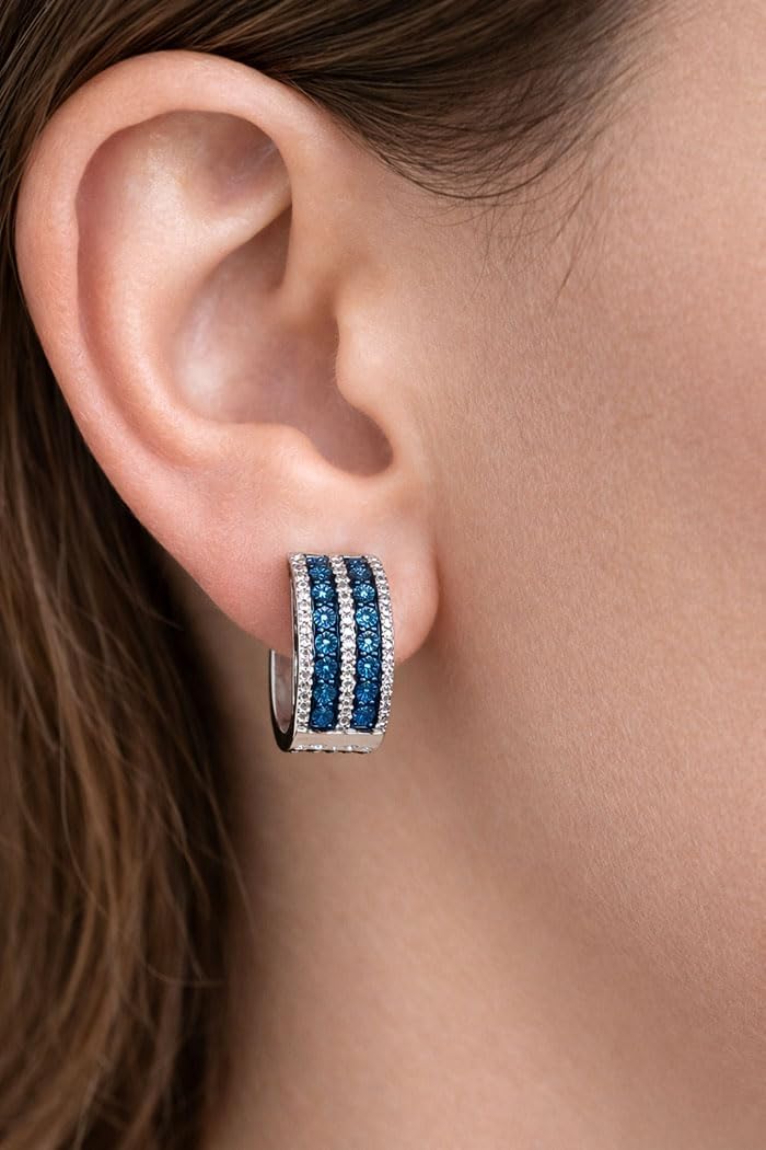 Add a touch of sophistication to your jewelry collection with these exquisite hoop earrings crafted in .925 sterling silver. The stunning design features two parallel rows of genuine blue diamonds, creating a mesmerizing contrast against the bright silver setting. The earrings showcase an elegant lattice pattern on the inner surface, demonstrating superior craftsmanship and attention to detail. These versatile hoops strike the perfect balance between classic and contemporary styling, making them suitable for both everyday wear and special occasions. The secure closure ensures comfortable, worry-free wear, while the premium materials guarantee lasting beauty. The combination of cool blue diamonds and polished sterling silver creates a luxurious look that will elevate any outfit, from business attire to evening wear. These refined hoop earrings make an ideal gift for someone special or a precious addition to your own jewelry box. B267410182247