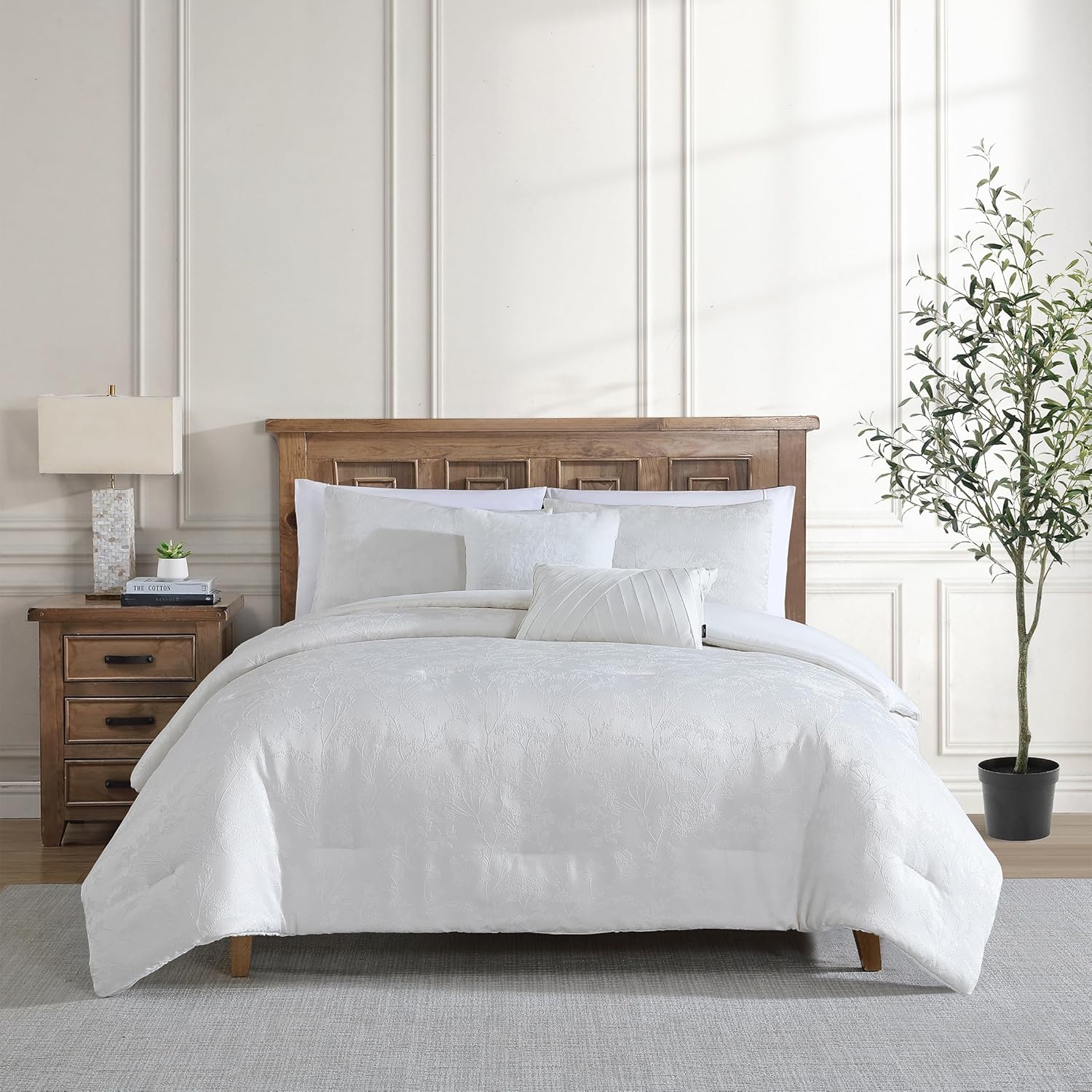 Give your bedroom decor a floral flourish with this 5-piece coordinating bed set from Tahari Home. A stunning addition to your primary bedroom, this King comforter is artfully woven with floral boucle designs for an effortlessly elegant look. This 5-piece bed set includes a comforter, coordinating king size shams, a faux fur 18" x 18" pillow, and a striped faux silk 12" x 20" pillow to complete the look. You can keep this easy-care bed set looking fresh by machine washing it in cold water with similar colors and drying it on a low setting as needed. The decorative pillows are spot clean only.