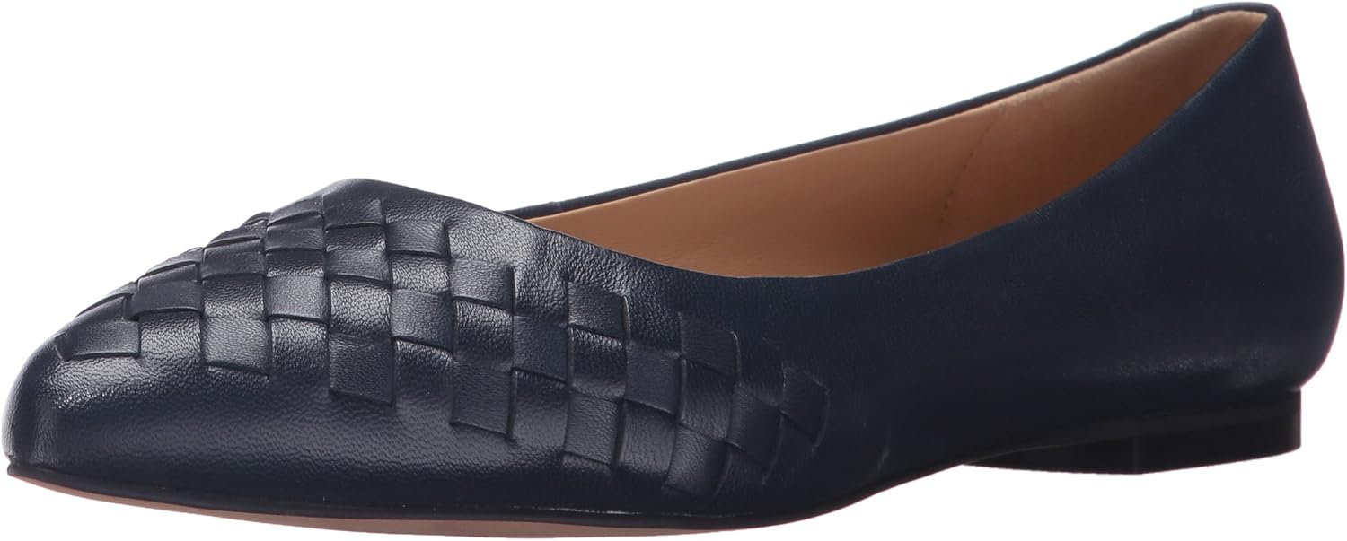 Our bestselling estee flat with a casual twist - estee woven! a hand woven vamp treatment gives visual interest to this fashionable pointed flat. the stitch and turn construction is flexible and comfortable for walking or working. a full leather upper lining pampers your foot. estee woven has a special leather combination footbed with sueded leather in the fore foot for a secure fit and all day comfort.
