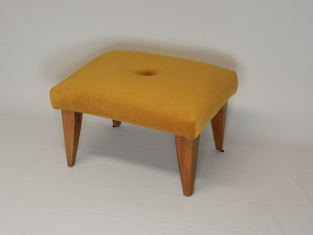 This hand-made footstool features seven colors of suere. The seat cushion is ornamented with a tufting button. The seat rests on four solid wood tapered lega finished in a medium brown stain. Dimensions are: 16" by 12" by 10" high.