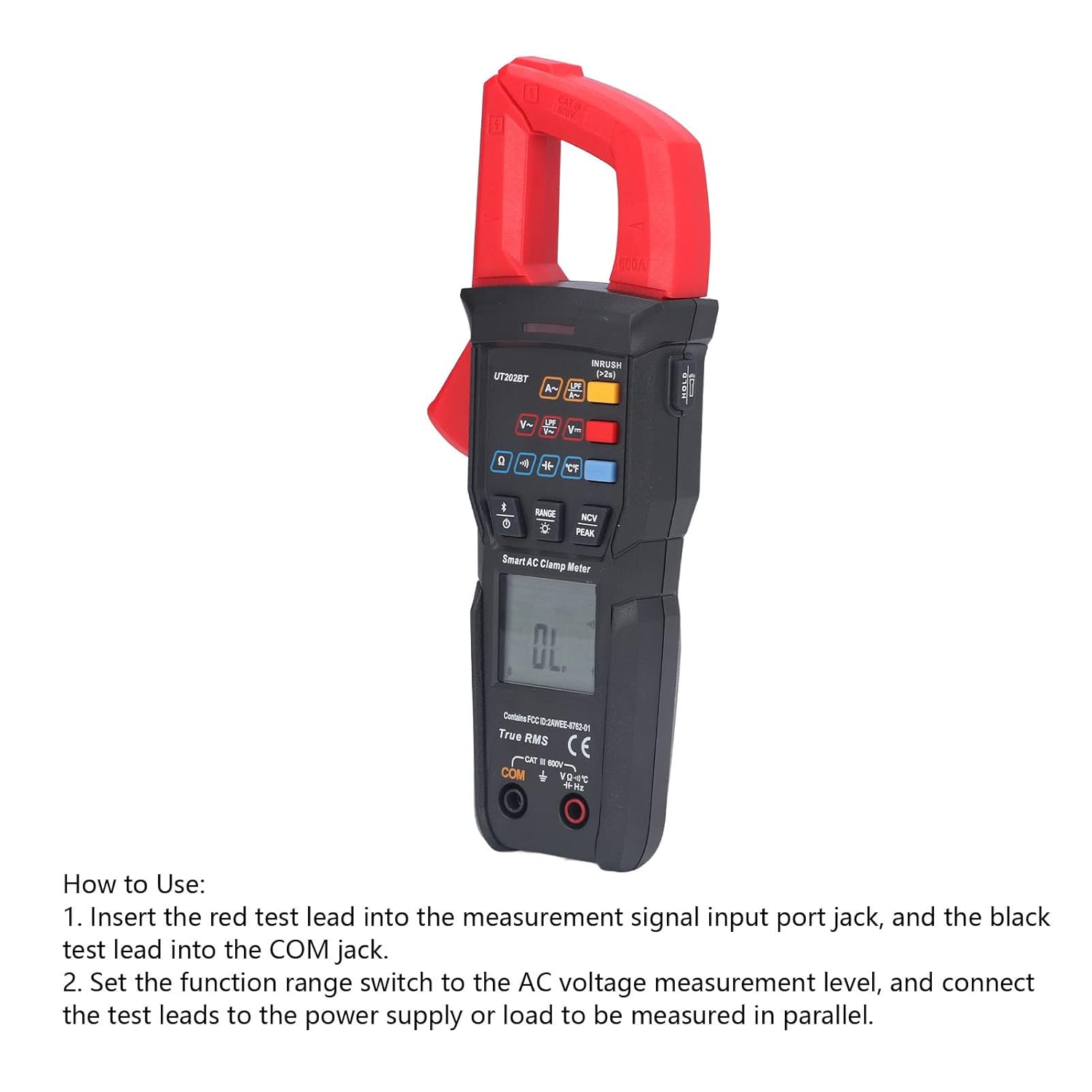 Specification: Item Type: Digital Clamp Meter Model: UT202BT Material: ABS Purpose: Electrical parameter detection Battery: 2 x 1.5V AAA(not included) Basic Parameters: DC Voltage: 9.999V, 99.99V, 600V AC Voltage: ACV 9.999V, 99.99V, 600V; ACV LPF 600V AC Current: ACV 9.999A, 99.99A, 600A; ACV LPF 600A; ACV Inrush 99.99A, 600A : 99.99Ω, 999.9Ω, 9.999kΩ, 99.99kΩ, 999.9kΩ, 9.999MΩ, 99.99MΩ How to Use: 1. Insert the red test into the measurement input port jack, and the black test into the COM jack. 2. Set the function range switch to the AC voltage measurement level, and connect the test leads to the power supply or load to be measured in parallel. Package List: 1 x Meter 2 x Meter Pen 1 x Temperature Probe 1 x User Manual 1 x Storage Bag