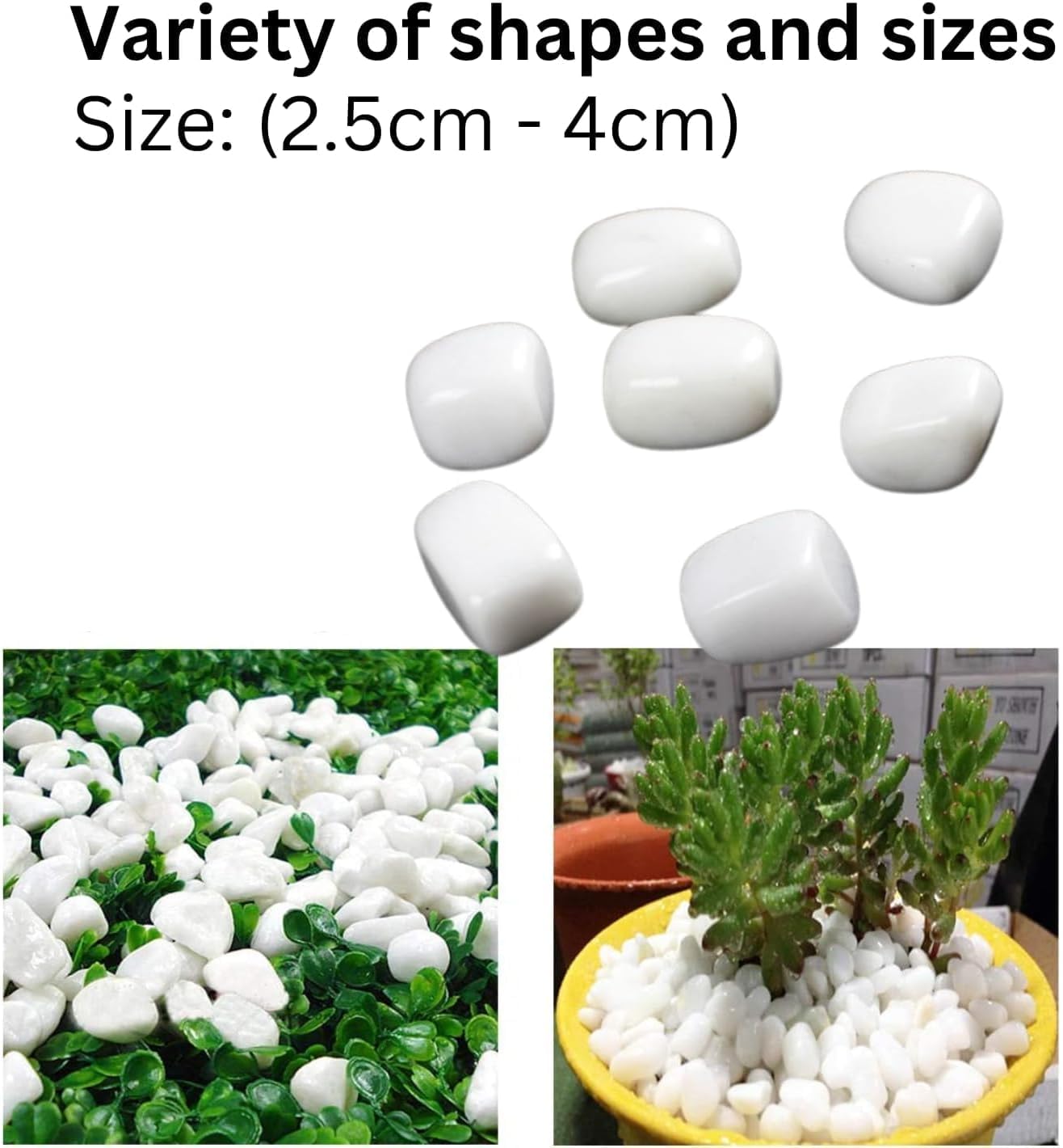 Transform your outdoor and indoor spaces with these elegant white polished pebbles, ranging from 1 to 1.6 inches in size. These glossy stones feature a smooth, lustrous finish that adds a sophisticated touch to any decorative application. Perfect for creating striking garden pathways, enhancing rock gardens, or adding visual interest around potted plants. The versatile stones work beautifully as vase fillers for floral arrangements or as a decorative substrate in aquariums. Their pristine white color provides excellent contrast against greenery and creates clean, modern landscape designs. The uniform size range ensures consistent coverage, while their polished surface maintains its attractive appearance over time. Use them to line walkways, create zen gardens, or design striking water features. These multi-purpose decorative stones are ideal for both indoor and outdoor applications, bringing natural elegance to any space they adorn. The pebbles are easy to arrange and maintain, making them a practical choice for both professional landscaping projects and DIY home decoration.