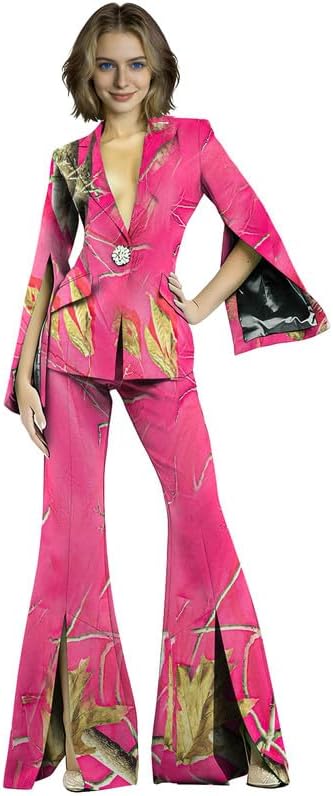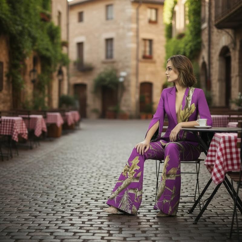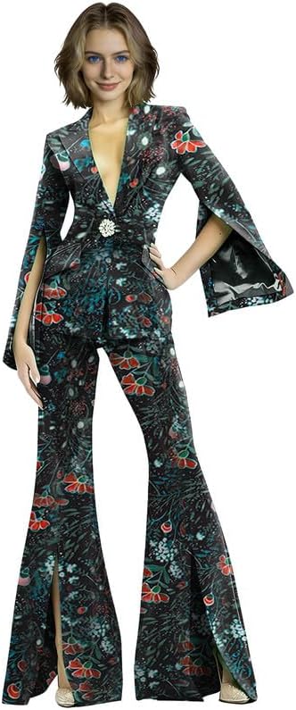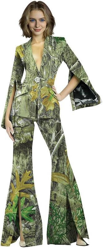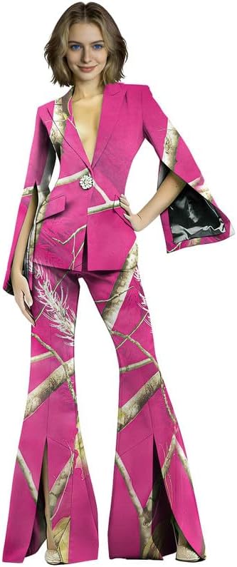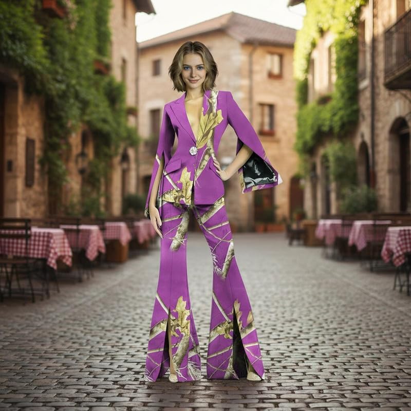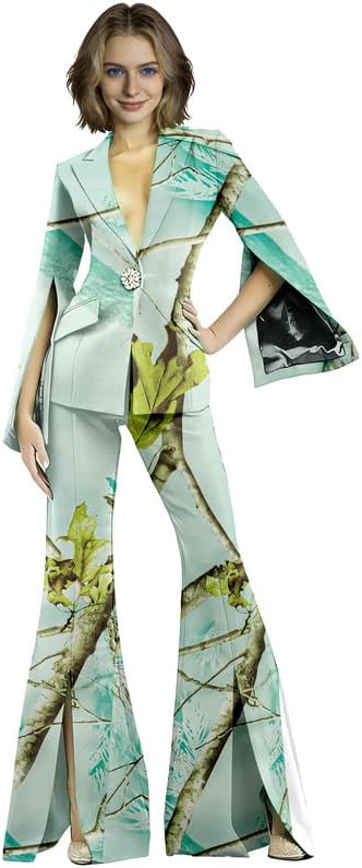 This 2 piece pant suit is your "all-rounder" for professional and social occasions, combining the sophistication of business attire with the personality of fashion-forward styling. The camouflage print breaks the monotony of traditional blazers, while split bell sleeves and split flare pants add a dynamic, flowing touch. A single exquisite crystal button adorns the blazer placket, instantly elevating the overall sophistication. Crafted from high-stretch fabric, it is soft, skin-friendly, and highly elastic, fitting snugly without restricting movement.