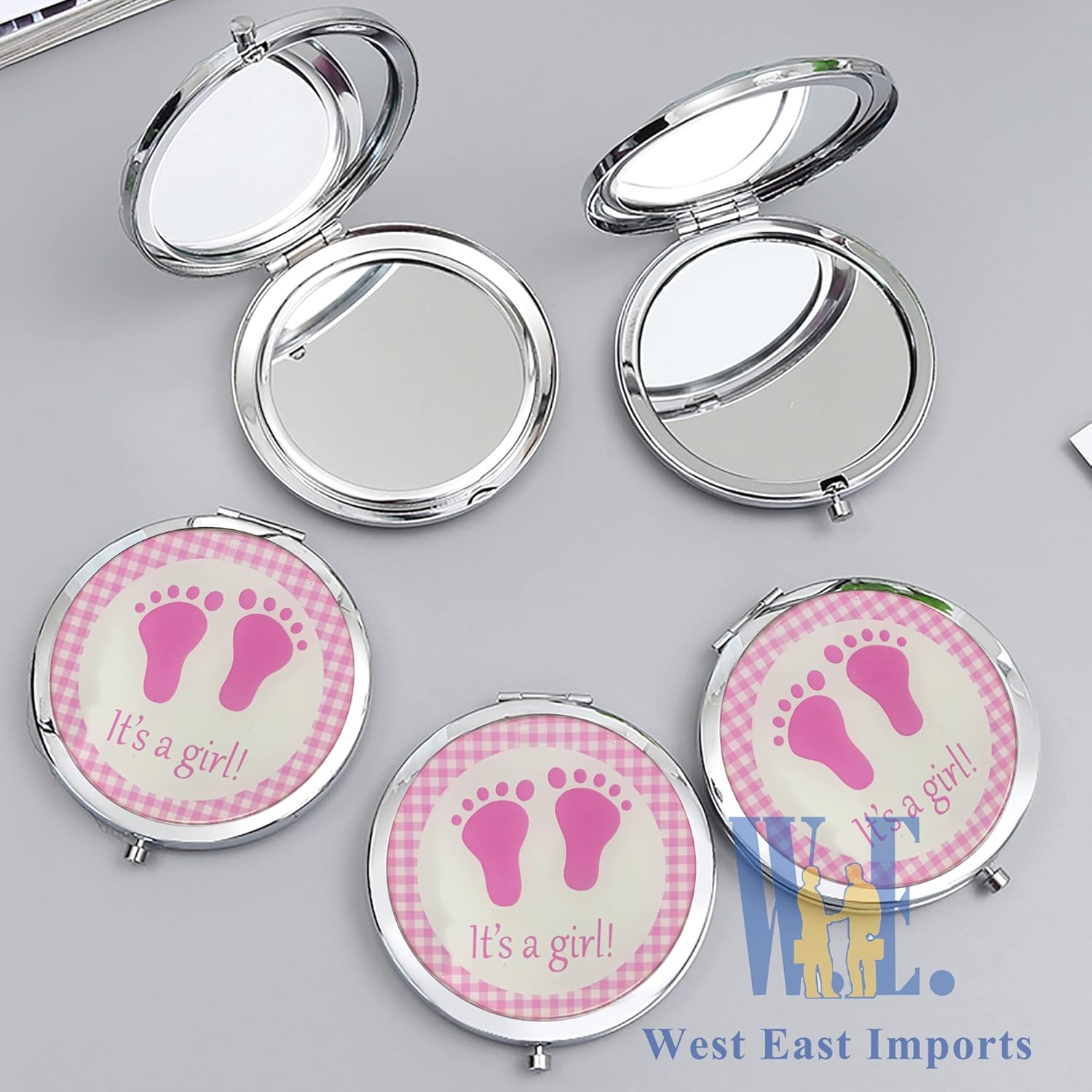 12 PCS Beautiful personalized Baby girl Shower Compact Mirror Favors for your guests. This baby shower compact mirrors can hold 3 lines of personalization with 20 characters on each line including spaces and punctuation. Cute pink footprint design compact mirror favors are the perfect choice for your baby shower. Your guests will appreciate these useful and practical compact mirror favors. Beautiful Metal baby show theme compact mirrors feature a round shape with both interior surfaces covered with regular and 3x magnified mirrors. Compact mirror favors are all come in an organza gift bag and ready to give out!