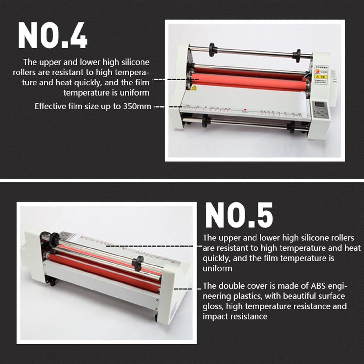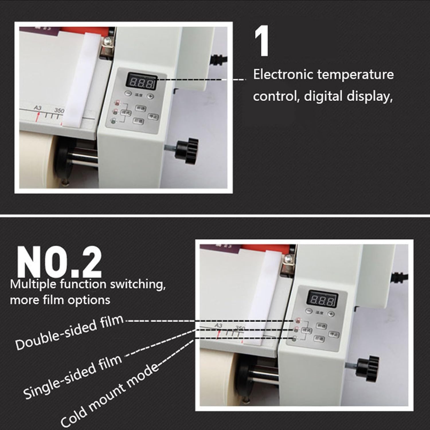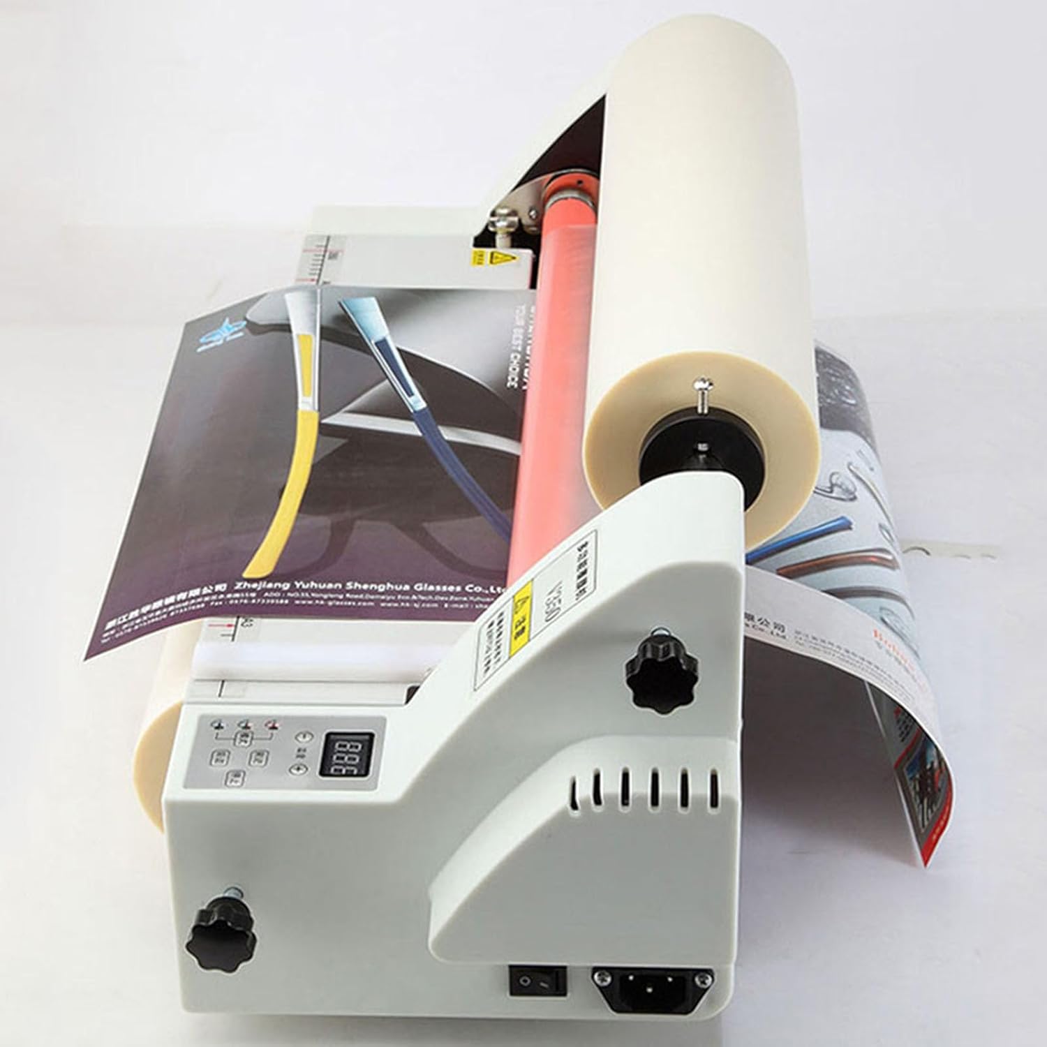 Product Specifications: Working power supply: 220V/50Hz Power consumption: ≤700W Film thickness: 0.1mm-5mm Film size: width 350mm, length can be customized Working temperature: 0°-140°C (cold table: room temperature, film 100-140°) Membrane core specification: 1 inch in diameter (254cm) Temperature control method: electronic temperature control, digital display Working method: cold lamination, single side lamination, double side lamination Machine size: 530*210*220mm Machine weight: 8KG (including packaging) Supporting materials: BOPP pre-coated film, PTE pre-coated film, DBW high-gloss film, high-grade cross pattern film Package includes: Laminating Machine*1