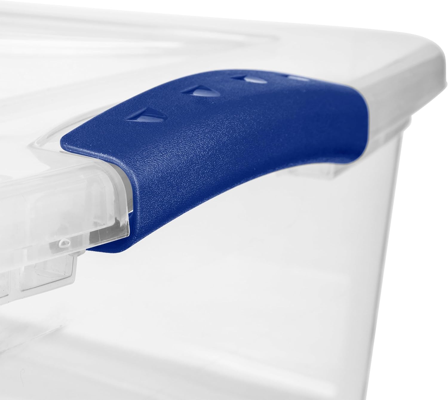Organize your home with these 2-Pack 32 Quart Clear Plastic Storage Bins. Made of sturdy plastic for durable daily use, these bins tackle clutter and save space efficiently in any room of your house. Featuring fully transparent bases and lids, you can quickly identify contents from any angle—no more rummaging through closed containers to find what you need. Durable blue latches securely fasten the lid to the base for a snug fit, shielding your items from dust and debris. Perfectly sized for under most beds, these bins turn unused underbed space into valuable storage, ideal for stowing seasonal clothes, linens, towels, blankets and more. The recessed lid design allows stable vertical stacking, maximizing space on closet shelves, pantries, dorms and bedrooms. Lightweight yet tough, this versatile storage solution meets all your organizing needs—from bedroom closets to college dorms and garages.