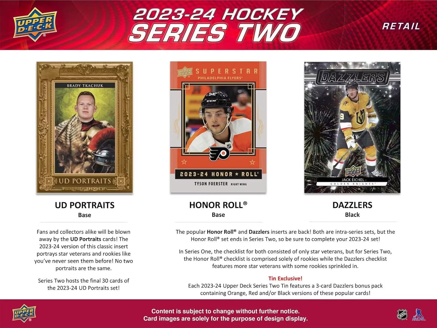 Enhanced Collecting Experience! We've revamped the Upper Deck Series for an even more engaging hobby. Key changes: Boosted insert-to-base ratio, now three (3) inserts per pack on average. Introducing a striking base set parallel, which also means more Young Guns cards to pursue! Despite adjusting pack and box configurations, each box still averages at least one (1) Young Guns card. Series 2 presents the next 250 cards (251-500) of the 2023-24 Upper Deck base set, featuring 198 veteran cards, 49 highly-anticipated Young Guns rookie cards, and three checklist cards. Keep an eye out for Outburst parallels! The 2023-24 UD Portraits insert showcases star veterans and rookies in unique portraits. Series 2 hosts the final 30 cards of this set. UD Canvas, a beloved intra-series set, highlights top stars, Young Guns, and Series 2-exclusive short-printed Retired and Program of Excellence subsets. The popular Honor Roll and Dazzlers inserts return, with the Honor Roll set concluding in Series 2. Each box averages one (1) Honor Roll card and one (1) Green Dazzlers card, exclusively available in Blasters!