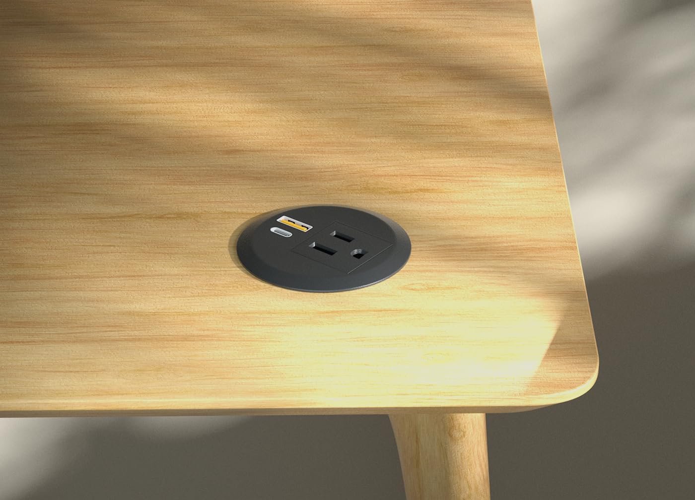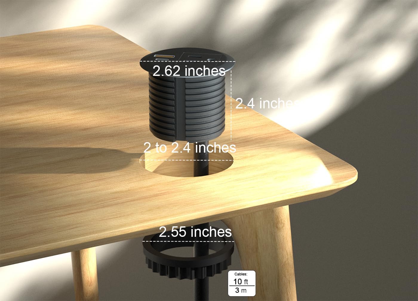 This desktop power grommet is suitable for recessed installation in indoor furniture, such as desks, sofa tables, nightstands and other places, after installation and furniture to form an integral part, not only can always keep the countertops neat, but also convenient to use electricity, eliminating the cluttered wiring harness of ordinary sockets. It also comes with 2 USB slots that support PD20W fast charging, convenient for charging small desktop items.Installation stepsTake off the lock ring and put the recessed outlet into the 2-2.4 inches holeTighten up the lock ring between desk outlet and countertopSpecifications:Rated Voltage: 125VRated Current: 12AMaximum Power: 1500WFrequency: 60 HzPower Cord: 6.41ft/9.71 ft,SJT16USB-C:5V/3A,9V/2.22A,12V/1.67A,Max:20WUSB-A:5V/3A,9V/2A,12V/1.5A,Max:18W*PD20W fast charging rate can be achieved when using USB-C only,QC 18W fast charging rate can be achieved when using USB-A only,and the total output power is up to 5V/3.1A 15.5W Max when using other USBs at the same timeInstallation conditionsPlease be sure to check the following dimensions to avoid non-compliance with the installation conditions:Counter Cutout Size: 2-2.4-inch Round HoleDepth under the counter: 2.4 -inchBottom Locking Ring Size under the counter:2.55-inchPower Grommet Panel Size:2.62-inchThis product has passed the safety certification of ETL, please feel free to use it!Certification Body: Intertek Testing Services Shenzhen Limited Guangzhou BranchCONFORMS TO UL STD.962ACERTIFIED TO CSA C22.2 NO. 308