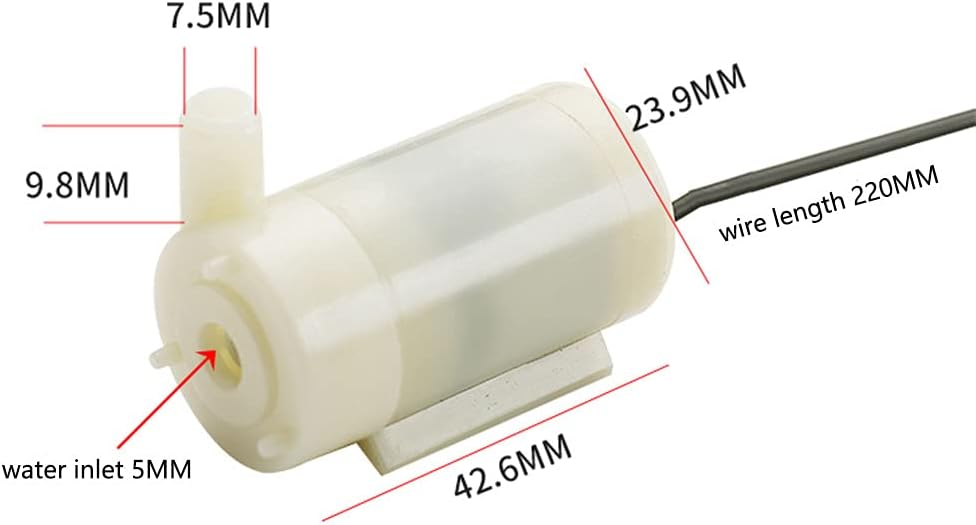Description: - 1.Professional Design, good material, Small motors will not produce too much noise. 2. 4pcs submersible pump, used to cooling water circulation, fit for pet fountain, aquarium, small fish pond, solar power system, etc. 3. Mini Submersible Pump. No load of water discharge capacity 100L / H; Rated voltage DC 3V to 5V. High head is 0.3-0.8m/1-2.5ft. 4. It is a economical design of motor pump, with low power consumption and save electricity. 5. This submersible pump can be used for small size aquarium, Fish tank, Pond, tabletop fountains, water gardens and hydroponic systems. 6. Flow Rate:1.2-1.6L/ Min. Power Source:Battery (NOT included). 7. Cable Length: 3 meters / 10 feet Package: 4 x DC 3V 5V Mini Water Pump. 1 x 10ft Water Pipe.