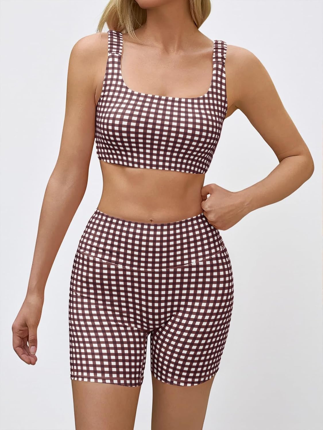 Meet Aoysky gingham sports crop tank short sets a thoughtfully designed for fashion casual & workout womens to become your go-to for daily wear yet supportive enough to push you through your toughest workouts. Our Aoysky gingham ruched sports 2 piece outfits is ultra-soft fabric designed to flatter and support. Notable features of our gingham yoga sports bras include breathable, a built in sports bra with removable padding and supportive underband & a breathable open-back detail added to support you through every movement. Workout plaid short notable features include comfortable seamless, a moderate compression waistband with high waist fit, and back-side V-seam added to accentuate your curves without sacrificing functionality.