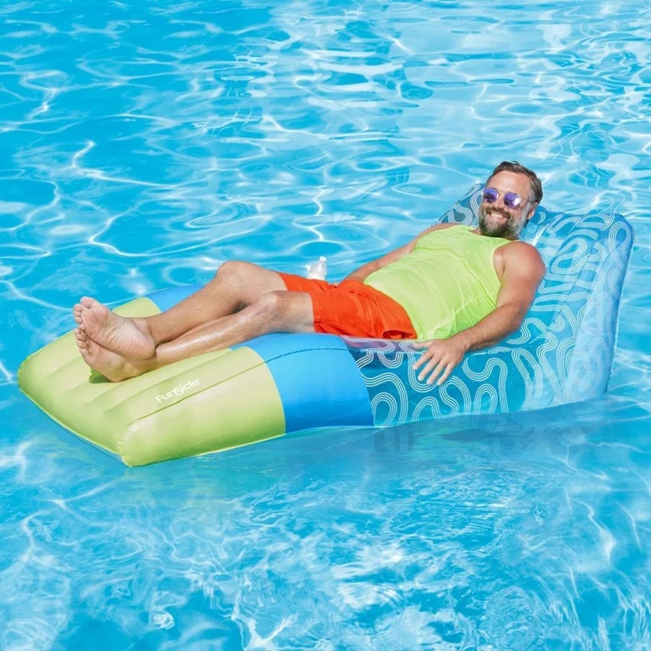 The Squiggle Chaiser Lounge is the go-to inflatable pool float for anybody wanting to relax on the water. You can stretch back and chill, while staying completely dry. Available in a bright unisex color and trendy pattern design, you stand out on the water. This inflatable water chair provides extra back support for all types of bodies for a comfy ride. Easy-to-inflate, all adults looking for the most relaxing swimming pool float will love the Funsicle Squiggle Chaiser Lounge.