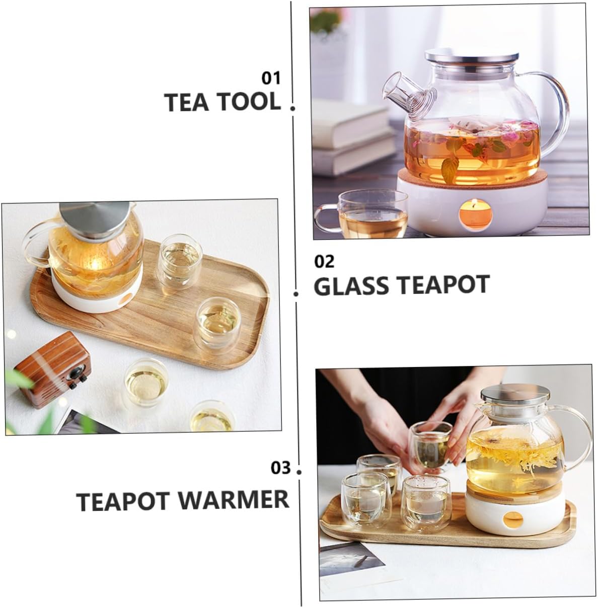 Package Include 1 x Teapot 1 x Teapot Warmer Features -Material: Glass Glass Teapot. -Size (teapot warmer): About 14.8X14.8X5cm/ 5.8x5.8x2in Teapot Warmer Heater. -Size (teapot): About 13.50X13.50X6.80cm/ 5.31X5.31X2.67in Teapot. -Color: Assorted color Teapot Warmer. - The glass teapot is suitable for tea, scented tea, coffee and other drinks you like. Tea Tool - The teapot can be used in microwave oven and refrigerator Kettle. - Manufactured with premium glass material, and enough to use Teapot Heater. - This product includes a teapot and a teapot warmer Tea Pot. - Put a candle into the teapot warmer and it can heat the tea.Goods DescriptionTeapot Warmer , very .Tea Pot The glass teapot is suitable for tea, scented tea, coffee and other drinks you like.Teapot Heater Manufactured with premium glass material, and enough to use.Teapot Warmer Heater This item includes teapot and teapot warmer.Tea Tool The temperature difference of -30~150℃ is acceptable