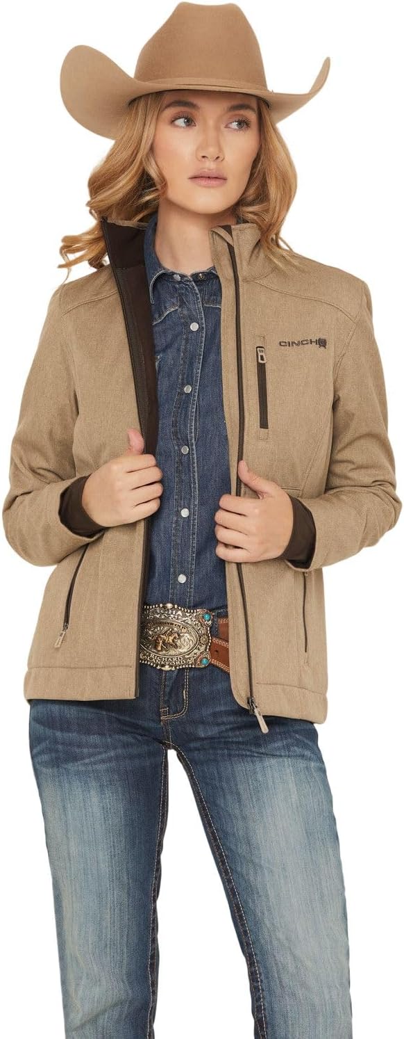Cinch Women's Conceal Carry Bonded Jacket Color: Tan Textured Polyester and Spandex Blend Logo Embroidery Storm Cuffs DWR Finish MAJ9856005 The Cinch Women’s Conceal Carry Bonded Jacket in tan offers a perfect mix of practicality and Western style. Made from a textured polyester and spandex blend, this jacket provides durability, stretch, and comfort for active days. Featuring discreet concealed carry pockets, storm cuffs for added protection, and a DWR finish for water resistance, it’s designed for versatility and reliability. Logo embroidery adds a signature Western touch.
