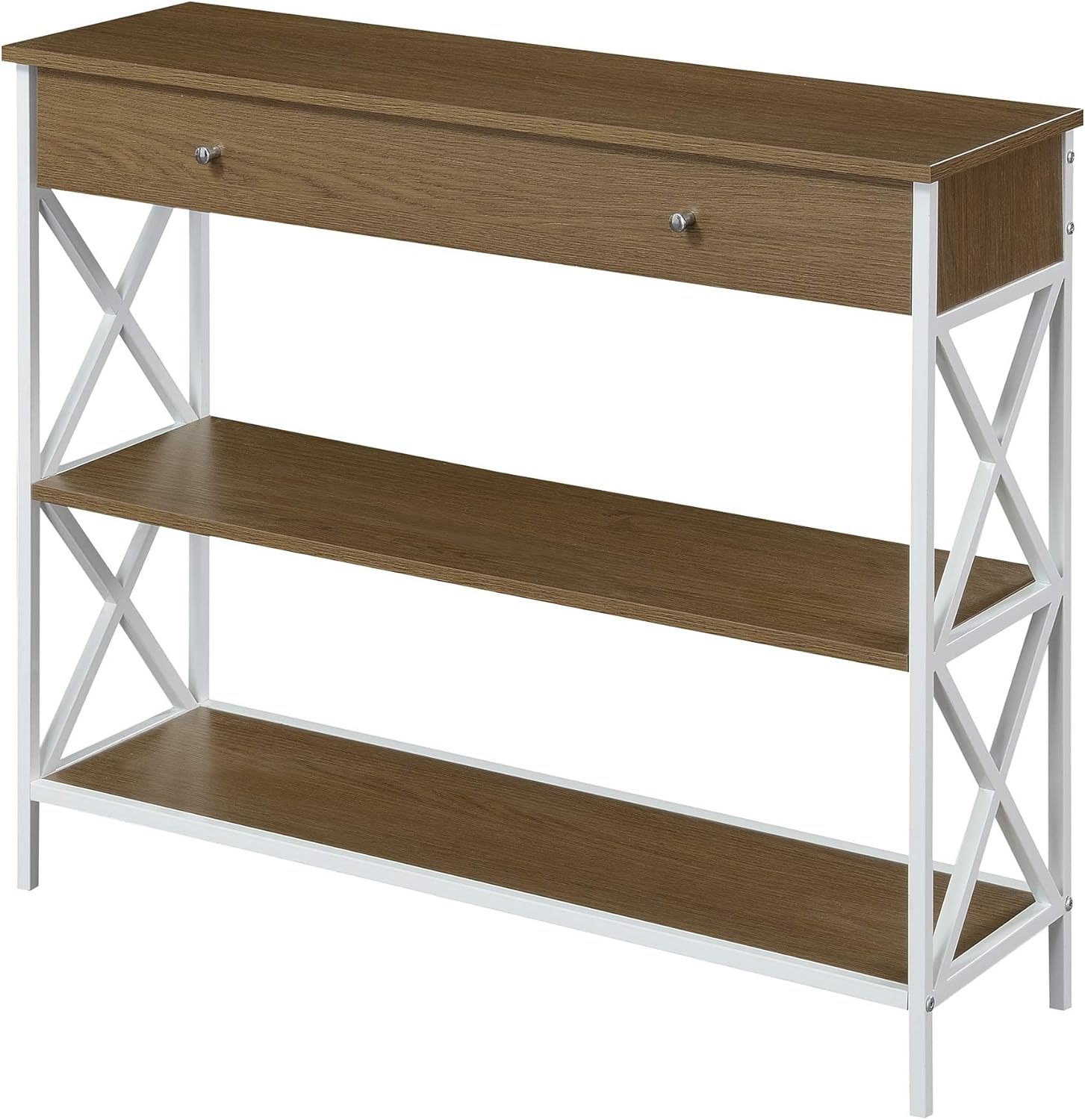 Upgrade your living space with the modern touch of the Tucson 1 Drawer Console Table with Shelves by Convenience Concepts. Featuring a pull-out drawer perfect to stow away keys, entertainment essentials and more. This table also includes generous top surface space, a middle shelf, and a bottom shelf. Ample space provides additional space to display decor, collectibles, and even books. The black crisscross frame is sure to make a statement in any room in your home. Available in a variety of finishes, this table is crafted from particle board and powder coated metal for long term use. Shop coordinating pieces from the Tucson Collection by Convenience Concepts, each sold separately.